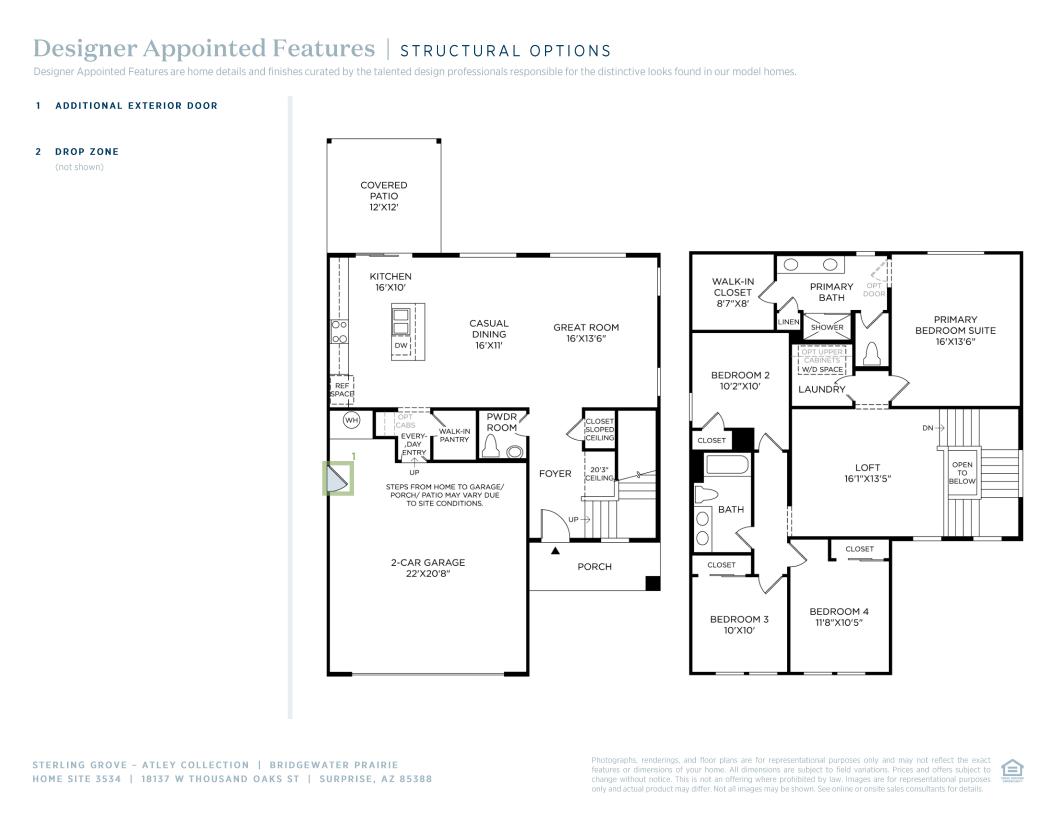 The Bridgewater offers an open, inviting floor plan designed for both daily living and memorable gatherings. A welcoming foyer leads into the great room, casual dining area, and kitchen. The kitchen features a center island with a breakfast bar and a walk-in pantry, ideal for casual meals or entertaining. Just off the main living area, a covered patio expands the home’s living space outdoors. Upstairs, the elegant primary suite includes a generous walk-in closet and a luxurious bath with a dual-sink vanity, a shower, and a private water closet. Three secondary bedrooms share a full hall bath and provide privacy and comfort for family or guests. A central loft offers additional space for gathering or relaxing. Other highlights include a second-floor laundry area, main-level powder room, and everyday entry.