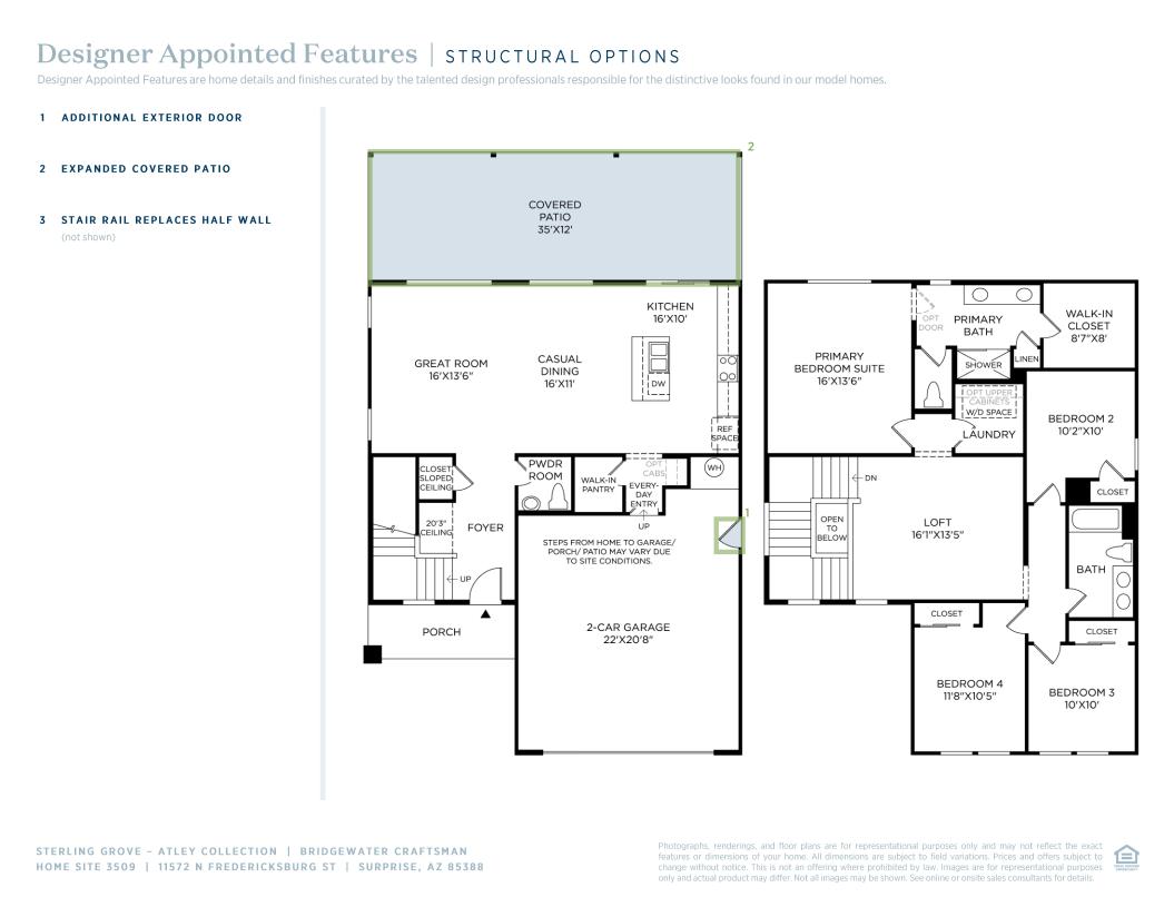 The Bridgewater offers an open, inviting floor plan designed for both daily living and memorable gatherings. A welcoming foyer leads into the great room, casual dining area, and kitchen. The kitchen features a center island with a breakfast bar and a walk-in pantry, ideal for casual meals or entertaining. Just off the main living area, a covered patio expands the home’s living space outdoors. Upstairs, the elegant primary suite includes a generous walk-in closet and a luxurious bath with a dual-sink vanity, a shower, and a private water closet. Three secondary bedrooms share a full hall bath and provide privacy and comfort for family or guests. A central loft offers additional space for gathering or relaxing. Other highlights include a second-floor laundry area, main-level powder room, and everyday entry.