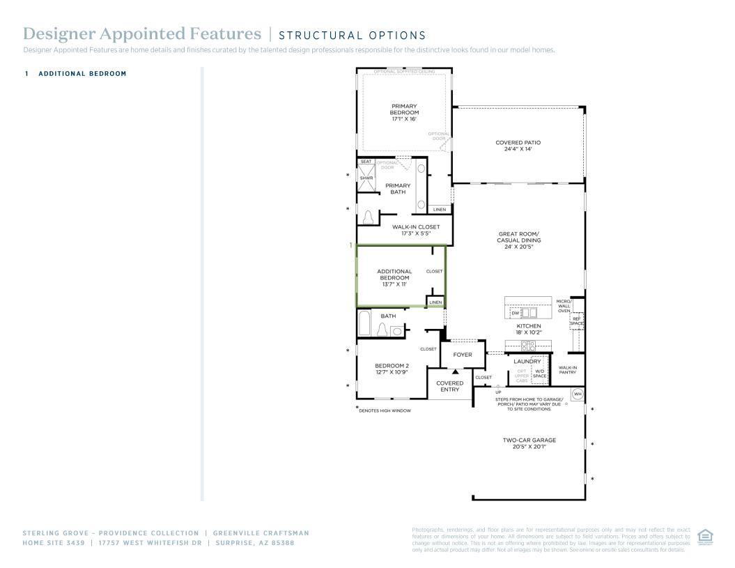 Deluxe urban style. The Greenville's inviting covered entry and welcoming foyer open onto the expansive great room and casual dining area, with views of the desirable covered patio. The well-equipped kitchen is enhanced by a large center island with breakfast bar, plenty of counter and cabinet space, and ample walk-in pantry. The sophisticated primary bedroom suite is complete with a spacious walk-in closet and spa-like primary bath with dual-sink vanity, luxe glass-enclosed shower with seat, linen storage, and private water closet. The secondary bedroom features a roomy closet and shared full hall bath. Additional highlights include a generous office off the great room, centrally located laundry, and additional storage.