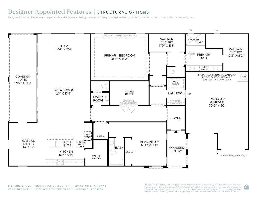 Deluxe urban living. The Cranston's inviting covered entry and welcoming foyer draw guests toward views of the expansive great room and desirable extended covered patio beyond. The well-designed kitchen overlooks a bright casual dining area, and is enhanced by a large center island with breakfast bar, plenty of counter and cabinet space, and huge walk-in pantry. The lovely primary bedroom suite is complete with dual walk-in closets and spa-like primary bath with dual-sink vanity, luxe glass-enclosed shower with seat, and private water closet. The generous secondary bedroom features a roomy closet and private full bath. Additional highlights include an enormous walk-in linen storage area off the great room, convenient powder room, centrally located laundry, and additional storage.