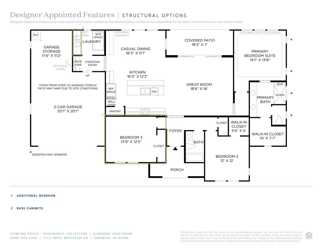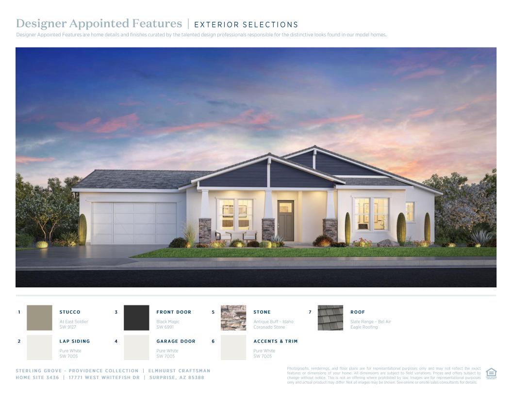 The Elmhurst features an alluring open concept floor plan that offers versatile indoor and outdoor living spaces. A welcoming front porch and foyer opens into the stunning great room, overlooking a desirable covered patio, bright casual dining area, and the well-appointed kitchen that features an oversized center island with breakfast bar, ample counter and cabinet space, and a sizable pantry. The beautiful primary bedroom suite is secluded off the great room, complemented by a generous walk-in closet and a lovely primary bath featuring a dual-sink vanity, a large luxe shower with seat, and a private water closet. The secondary bedroom is adjacent to a spacious flex room and offers a walk-in closet as well as a shared hall bath. Easily-accessible laundry, an everyday entry with drop zone, and plenty of additional storage are also highlighted in the Elmhurst.