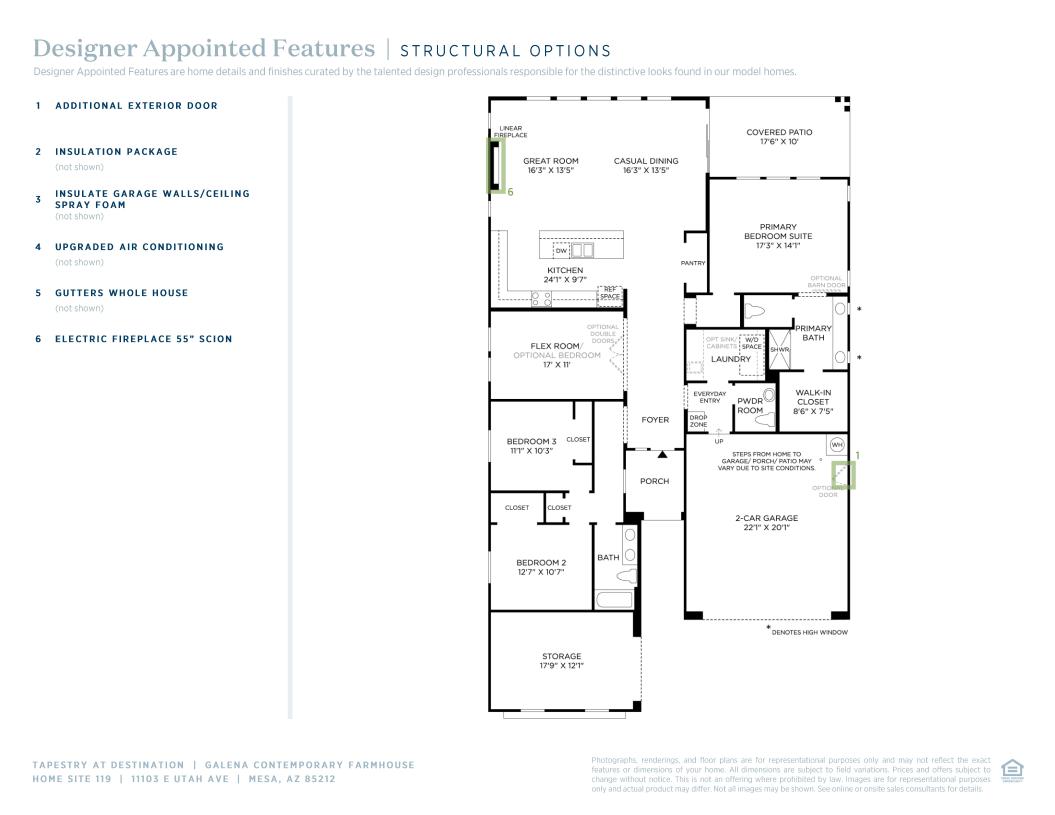 With a timeless look and a convenient single-story layout, the Galena offers effortless style throughout. A comfortable porch flows into a grand foyer and wide-open kitchen featuring an enormous pantry with double doors, generous counter space, and a striking center island with breakfast bar. The primary bedroom suite rivals the accommodations at a five-star resort, thanks to its attached walk-in closet and spa-like primary bath, dual-sink vanity, private water closet, and roomy shower. Secondary bedrooms have their own sizable closets and access a shared hall bath. Storage and flex rooms along with a powder room and laundry room off the foyer offer versatility to suit every lifestyle.