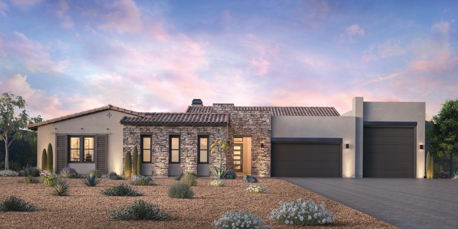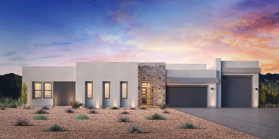 The Parker redefines style and comfort through its use of thoughtful features and well-designed floor plan. A welcoming foyer leads into a stunning great room highlighted by a linear fireplace and easy access to an expansive covered patio. A well-appointed gourmet kitchen features a large center island with a breakfast bar and a generous walk-in pantry, that flows into a casual dining space, ideal for daily meals and gatherings. A luxurious primary bedroom suite includes a spacious walk-in closet and a spa-like bath with dual vanities, a soaking tub, a soothing shower, and a private water closet. Two secondary bedrooms with ample closet space and personal full baths offer privacy and convenience for family or guests. Other highlights include a versatile flex room, an office, an inviting courtyard, an everyday entry, a drop zone, a two-car garage and a separate one-car garage.