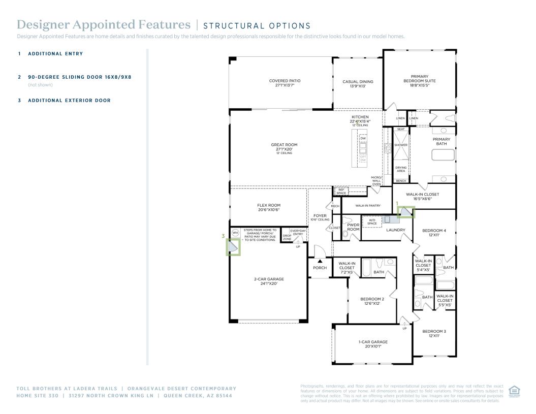 The Orangevale's thoughtful design offers stunning living spaces indoors and out. The elegant foyer opens into a spacious flex room and an impressive great room with sliding door access to an expansive covered patio. The well-appointed kitchen is complemented by a lovely casual dining area, an oversized center island with breakfast bar, plenty of counter and cabinet space, and an ample walk-in pantry. Completing the deluxe primary bedroom suite is a generous walk-in closet and a relaxing primary bath with dual vanities, a soaking tub, a luxe shower with seat and drying area, linen storage, and a private water closet. Secondary bedrooms feature walk-in closets and private baths. Additional highlights include conveniently located laundry, a powder room, and extra storage throughout.
