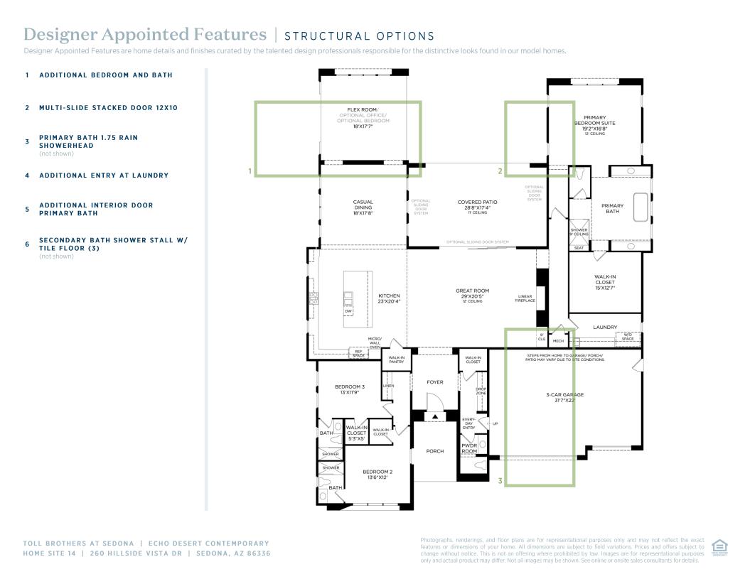 The Echo artfully balances lively gathering spaces with quiet retreats. Warm and inviting, the foyer draws guests into a great room that seamlessly transitions into the expansive covered patio through large sliding glass doors. Adjacent to a bright casual dining area, the well-appointed kitchen boasts a large center island, a walk-in pantry, and wraparound counters. Nestled away, the airy primary bedroom features a spacious walk-in closet and a serene bath featuring dual vanities, a relaxing soaking tub, a luxe shower with seat, and a private water closet. Toward the front of the home are two generously sized secondary bedrooms with walk-in closets and private baths. Additional highlights include an everyday entry with drop zone, a powder room, a versatile flex room, and a dedicated laundry space.
