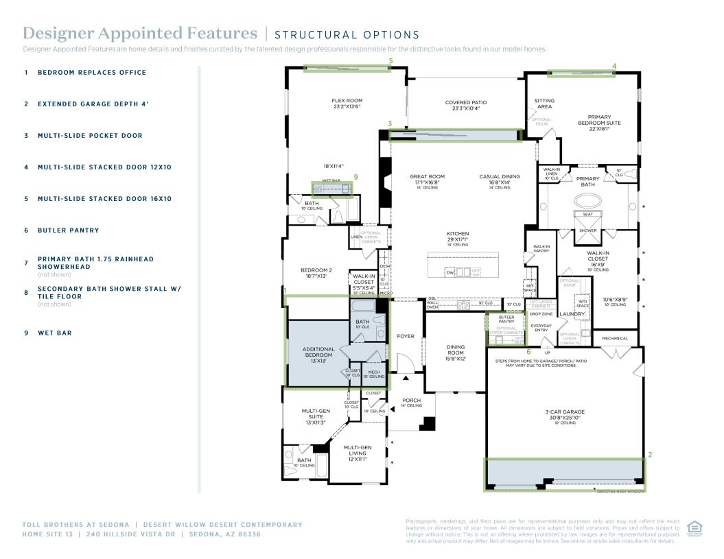 The kitchen is truly the heart of the Desert Willow home design. Designed for effortless entertaining, the main living area features a soaring open-concept great room and casual dining area opening onto a covered patio with access to an expansive flex room for exceptional indoor/outdoor living. The well-appointed kitchen is complemented by an oversize center island with breakfast bar, plenty of counter and cabinet space, generous walk-in pantry, and passthrough to the beautiful formal dining room. Enhancing the magnificent primary bedroom suite are a relaxing sitting area, dual walk-in closets, and an expansive primary bath with dual vanities, large soaking tub, luxe shower with seat, walk-in linen storage, and private water closet. The secondary bedroom features a walk-in closet and shared hall bath with separate vanity area. Additional highlights include a versatile multi-generational suite with living area, closet, private bath, and private entry.