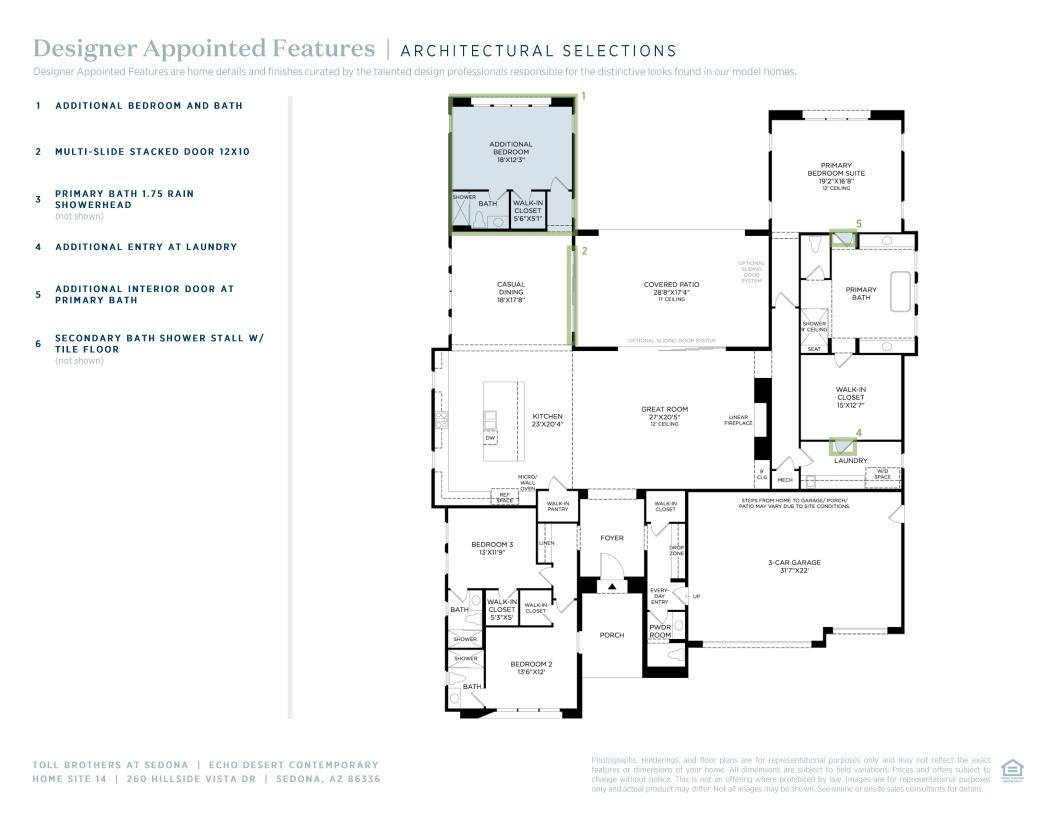 The Echo artfully balances lively gathering spaces with quiet retreats. Warm and inviting, the foyer draws guests into a great room that seamlessly transitions into the expansive covered patio through large sliding glass doors. Adjacent to a bright casual dining area, the well-appointed kitchen boasts a large center island, a walk-in pantry, and wraparound counters. Nestled away, the airy primary bedroom features a spacious walk-in closet and a serene bath featuring dual vanities, a relaxing soaking tub, a luxe shower with seat, and a private water closet. Toward the front of the home are two generously sized secondary bedrooms with walk-in closets and private baths. Additional highlights include an everyday entry with drop zone, a powder room, a versatile flex room, and a dedicated laundry space.