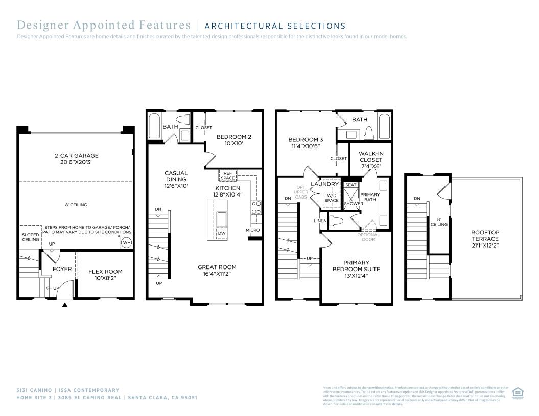 The Issa blends modern design with functional living spaces throughout its four-level layout. Step into a welcoming foyer and stairs that flow up to the main living area. Overlooking a casual dining area and the spacious great room, the open-concept kitchen is the focal point of the home, offering a center island and plenty of counter and cabinet space. Upstairs, the lush primary bedroom suite is enhanced by a sizable walk-in closet and a tranquil private bath complete with dual sinks, a large shower with seat, and a private water closet. One secondary bedroom with a private bath can be found on the third floor while another secondary bedroom is conveniently located on the main living level. An impressive rooftop terrace on the fourth floor offers exceptional outdoor entertaining and relaxation. Additional features include a versatile flex room on the first floor, a shared hall bath on the main living level, and bedroom-level laundry.
