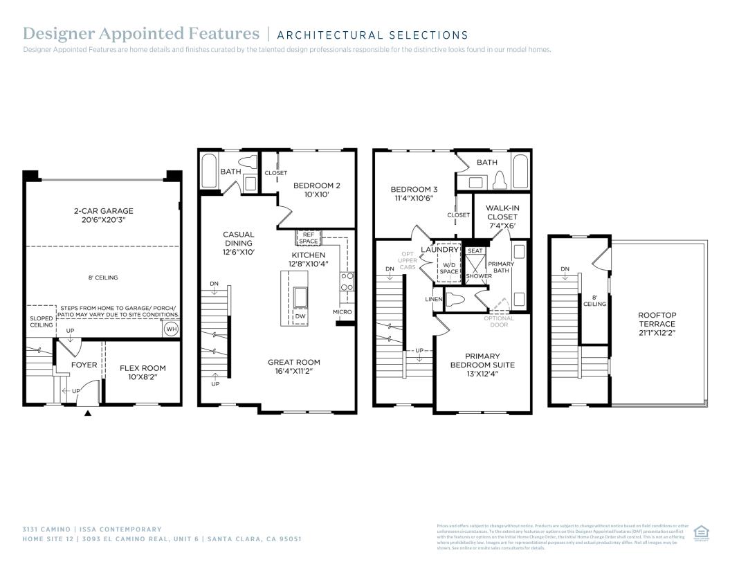 The Issa blends modern design with functional living spaces throughout its four-level layout. Step into a welcoming foyer and stairs that flow up to the main living area. Overlooking a casual dining area and the spacious great room, the open-concept kitchen is the focal point of the home, offering a center island and plenty of counter and cabinet space. Upstairs, the lush primary bedroom suite is enhanced by a sizable walk-in closet and a tranquil private bath complete with dual sinks, a large shower with seat, and a private water closet. One secondary bedroom with a private bath can be found on the third floor while another secondary bedroom is conveniently located on the main living level. An impressive rooftop terrace on the fourth floor offers exceptional outdoor entertaining and relaxation. Additional features include a versatile flex room on the first floor, a shared hall bath on the main living level, and bedroom-level laundry.
