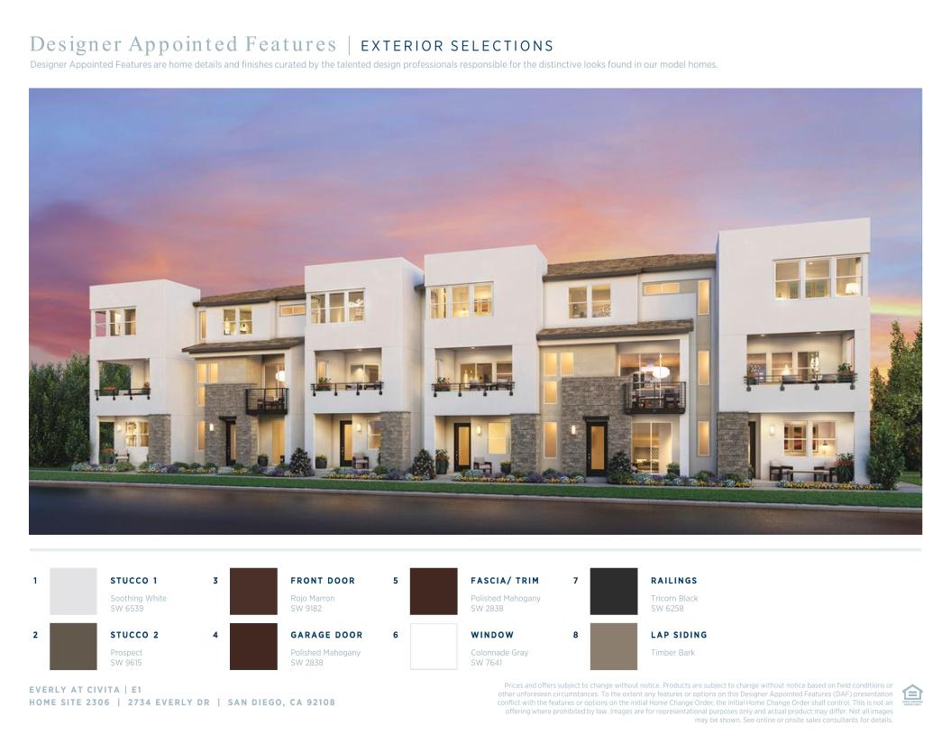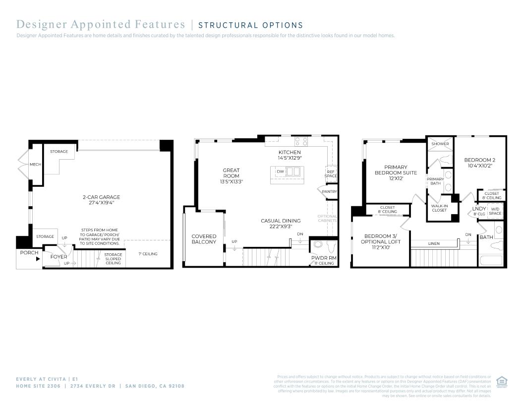 An intimate foyer and stairs lead to the E1's desirable open-concept floor plan with an extensive great room and casual dining area that features covered balcony access. The well-designed kitchen overlooks the main living area, and is complete with a beautiful central island with breakfast bar, wraparound counter and cabinet space, and an ample pantry. The third floor is highlighted by the deluxe primary bedroom suite that is enhanced by a palatial walk-in closet and superb primary bath with a luxurious shower and dual sink vanity. Spacious secondary bedrooms feature roomy closets and share a hall bath. A convenient powder room on the main living level, centrally located third-floor laundry, and ample storage are additional highlights.