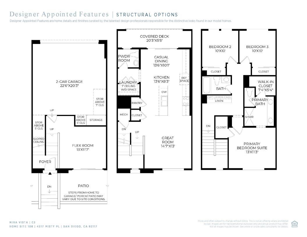 The C3 floor plan at Mira Vista, a new community located less than a mile from Mission Bay Beach in San Diego, offers luxurious coastal living in a 3-story attached condominium. This spacious home features 3 bedrooms and also features a downstairs space that's perfect for a home office, studio, or guest room. The layout also includes a generously sized outdoor patio, offering a great space for relaxation or entertaining guests. The expansive upstairs kitchen and great room in the secondary bedrooms provide ample room for comfort. This completed home showcases beautiful upgrades, including luxury wood vinyl flooring, KitchenAid appliances with a refrigerator, and a convenient side-by-side laundry space featuring a Whirlpool washer and dryer. Mira Vista's prime location puts you within vibrant neighborhoods like Little Italy, downtown San Diego, and La Jolla, along with convenient access to shopping and dining and the airport. This is coast living at its finest, blending luxury, convenience, and the beauty of San Diego's coastline.