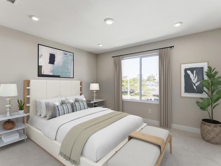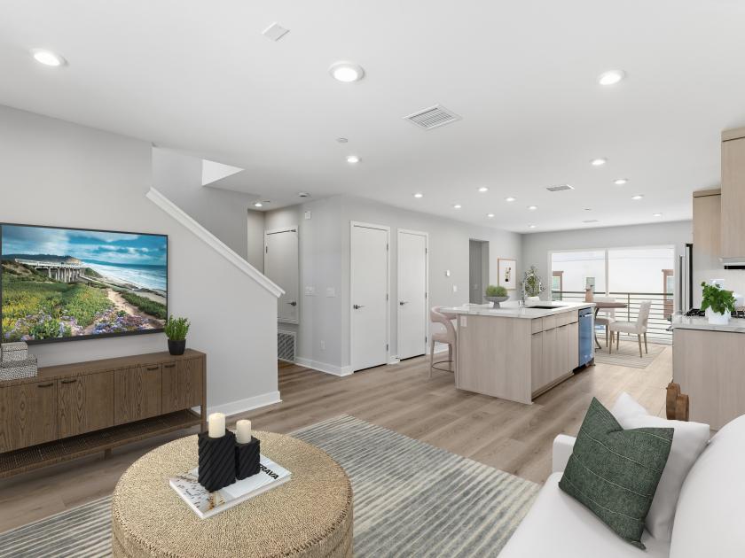 The C3 floor plan at Mira Vista, a new community located less than a mile from Mission Bay Beach in San Diego, offers luxurious coastal living in a 3-story attached condominium. This spacious home features 3 bedrooms and also features a downstairs space that's perfect for a home office, studio, or guest room. The layout also includes a generously sized outdoor patio, offering a great space for relaxation or entertaining guests. The expansive upstairs kitchen and great room in the secondary bedrooms provide ample room for comfort. This completed home showcases beautiful upgrades, including luxury wood vinyl flooring, KitchenAid appliances with a refrigerator, and a convenient side-by-side laundry space featuring a Whirlpool washer and dryer. Mira Vista's prime location puts you within vibrant neighborhoods like Little Italy, downtown San Diego, and La Jolla, along with convenient access to shopping and dining and the airport. This is coast living at its finest, blending luxury, convenience, and the beauty of San Diego's coastline.