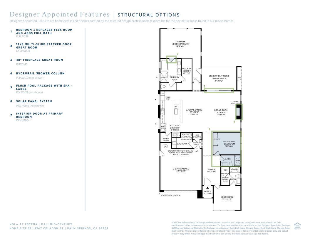 This Dali Mid-Century showcases a wonderfully crafted single-story floor plan that exudes modern luxury. Step into a spacious foyer that seamlessly flows to an expansive great room and a luxury outdoor living space, providing a versatile space for relaxing or hosting gatherings. Overlooking a casual dining area, the kitchen is well-designed, featuring a central island, ample counter and cabinet space, and a walk-in pantry. The primary bedroom suite is a serene retreat enhanced with a large walk-in closet and a spa-inspired private bath with dual vanities, a freestanding tub, a luxurious shower, and a private water closet. The secondary bedroom is secluded off the foyer and offers a walk-in closet and private bath. Additional highlights include a third bedroom and full hall bath, centrally located laundry, and an everyday entry for added convenience.