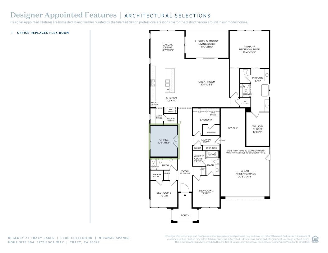 The beautifully crafted Miramar features an expansive great room and casual dining area, central to the airy foyer and luxury outdoor living space. A large center island with breakfast bar highlights the well-appointed kitchen, offering plenty of counter and cabinet space, a sizable walk-in pantry, as well as a thoughtful workspace. The marvelous primary bedroom suite is defined by a spacious walk-in closet and elegant primary bath complete with dual vanities, a soaking tub, a large shower with seat, and a private water closet. Ideally located off the foyer, secondary bedrooms, one with a private bath and one with a shared hall bath, feature ample closets. A versatile flex room is also featured in the Miramar, as well as a convenient everyday entry with drop zone, easily accessible laundry, and plenty of additional storage.