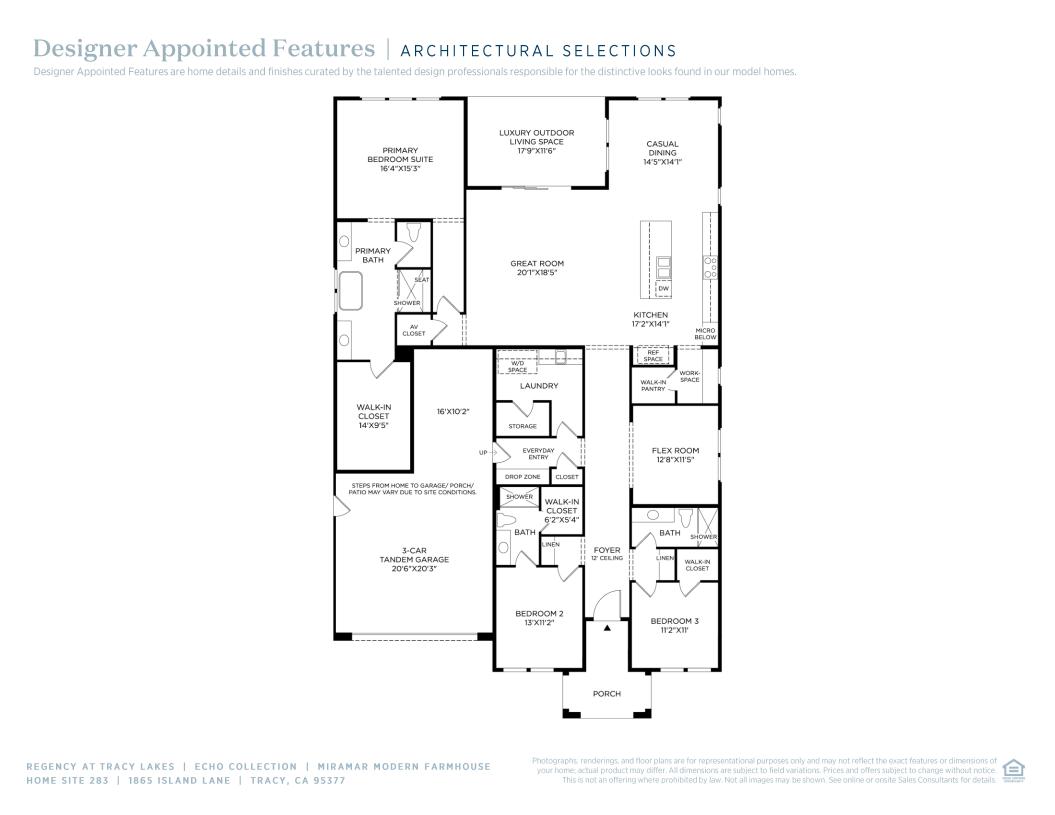 The beautifully crafted Miramar features an expansive great room and casual dining area, central to the airy foyer and luxury outdoor living space. A large center island with breakfast bar highlights the well-appointed kitchen, offering plenty of counter and cabinet space, a sizable walk-in pantry, as well as a thoughtful workspace. The marvelous primary bedroom suite is defined by a spacious walk-in closet and elegant primary bath complete with dual vanities, a soaking tub, a large shower with seat, and a private water closet. Ideally located off the foyer, secondary bedrooms, one with a private bath and one with a shared hall bath, feature ample closets. A versatile flex room is also featured in the Miramar, as well as a convenient everyday entry with drop zone, easily accessible laundry, and plenty of additional storage.