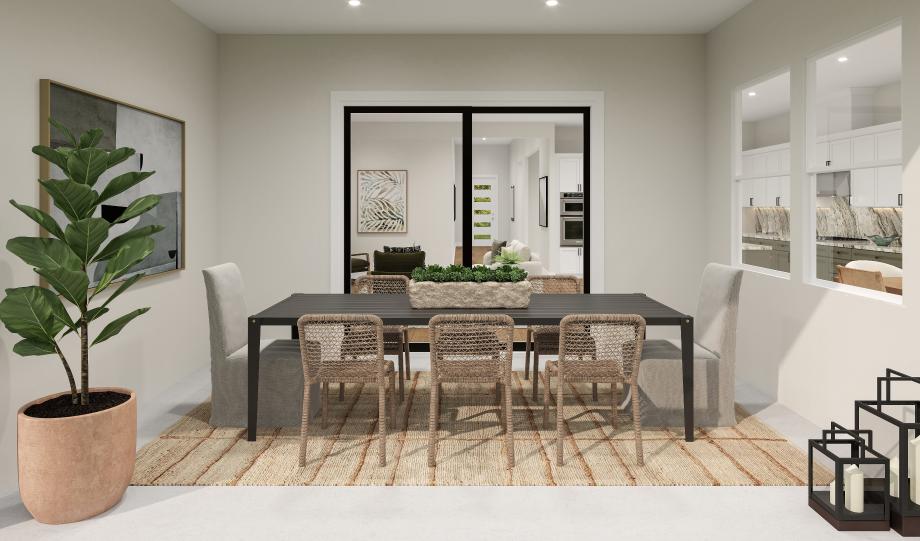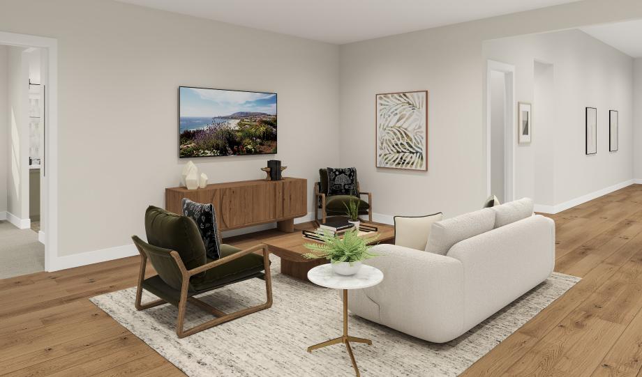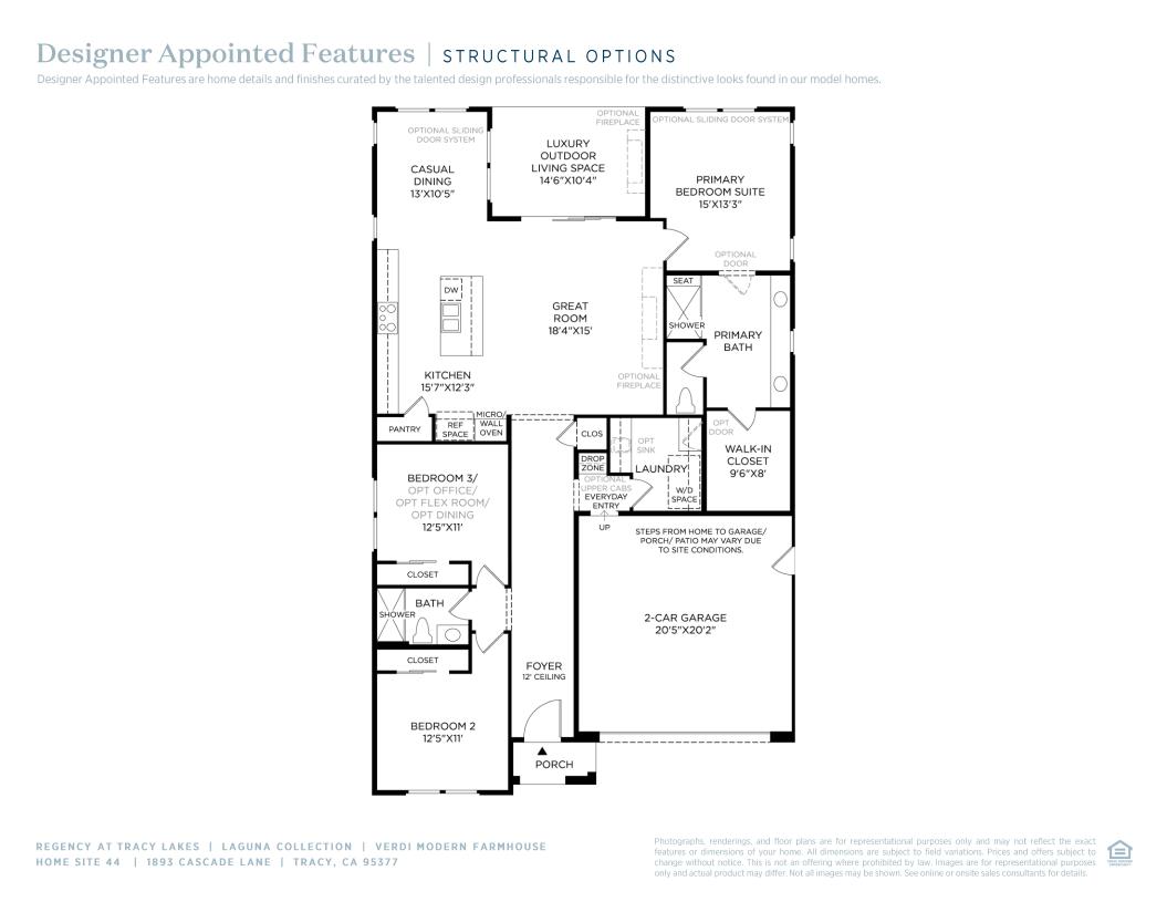 A beautiful extended foyer reveals a sizable flex room, and a view of the Verdi's soaring great room and luxury outdoor living space. The well-designed kitchen is defined by a bright casual dining area, large center island with breakfast bar, plenty of counter and cabinet space, and ample pantry. Highlighting the palatial primary bedroom suite are a generous walk-in closet and a marvelous primary bath with dual vanities, a large luxe shower with seat, and a private water closet. The secondary bedroom features an ample closet and shared hall bath. Additional highlights include a convenient everyday entry with drop zone, a centrally located laundry, and additional storage throughout.