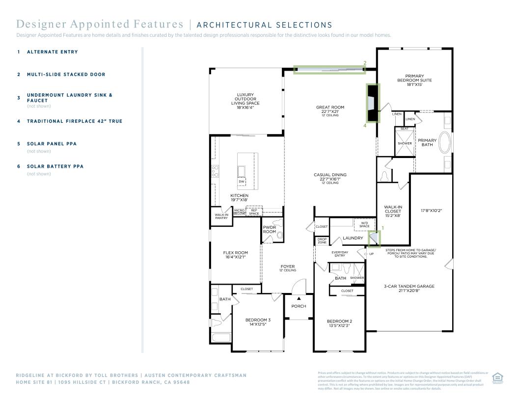 The Austen home design is an exquisite blend of elegance and practicality. An inviting foyer leads past a versatile flex room ideal for work, hobbies, and more. At the heart of the home is a casual dining area and a sophisticated great room, creating a space where meals and conversation can intertwine. The well-equipped kitchen flows seamlessly into the beautiful outdoor living space and features a large island with breakfast bar, generous cabinet space, and a walk-in pantry. The secluded primary bedroom offers a large walk-in closet, and a spa-like bath with dual vanities, a luxe shower with seat, linen storage, a relaxing soaking tub, and a private water closet. Two lovely secondary bedrooms with ample closets offer private baths. Other highlights include an everyday entry with drop zone, centrally located laundry, a powder room, and plenty of extra storage.