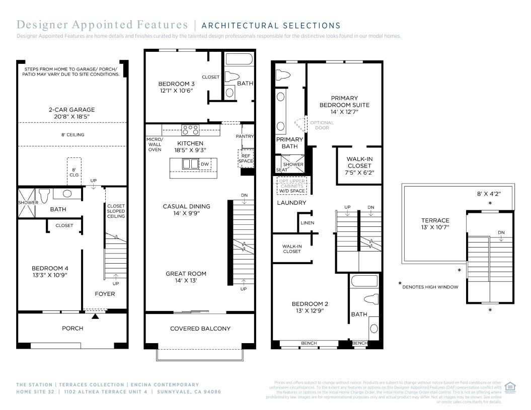 The Encina's foyer and stairs flow up to the bright living level on the second floor, revealing the spacious great room, covered balcony, and charming casual dining area. The thoughtfully designed kitchen is highlighted by a large center island with breakfast bar, plenty of counter and cabinet space, and a roomy pantry. On the third floor, the gracious primary bedroom suite is enhanced by an ample walk-in closet and a gorgeous primary bath with a dual-sink vanity, a large luxe shower with seat, and a private water closet. The large secondary bedroom features a walk-in closet and private bath. Secluded on the fourth floor is a generous terrace for entertaining options. Additional highlights include bedrooms with closets and shared hall baths on the first and second floors, conveniently located laundry on the primary bedroom level, and plenty of additional storage.
