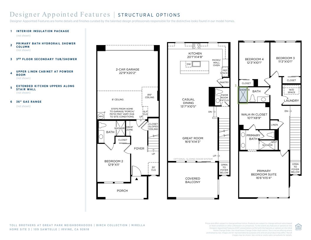 The Mirella home design offers stylish living with an open floor plan and generous space for both relaxation and entertaining. Just off the welcoming foyer, a secondary bedroom with access to a full hall bath provides comfort and privacy for family members or overnight guests. On the second floor, the expansive great room flows into the casual dining area and a well-appointed kitchen featuring a large center island, wraparound counters, and a pantry. A covered balcony off the great room extends the living area outdoors, creating the perfect spot for fresh-air enjoyment. Upstairs, the private primary suite includes a spacious walk-in closet and a serene bath with a dual-sink vanity, a shower with seat, and a private water closet. Two additional secondary bedrooms share a beautifully designed full hall bath on this level. Additional highlights include a third-floor laundry area, a second-floor powder room, and a two-car garage.