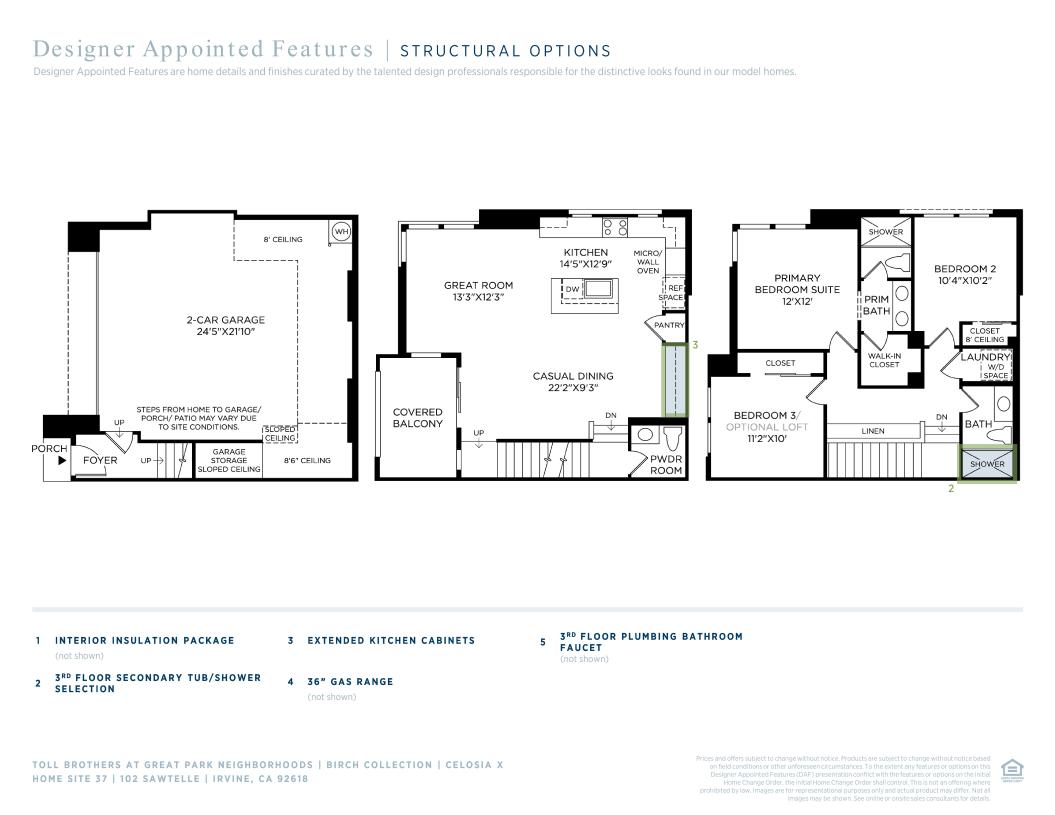The Celosia X is a modern three-story townhome that combines contemporary design with smart, versatile living. A welcoming foyer sets the tone and leads to the second floor, where an open-concept layout connects the great room, casual dining area, and a well-equipped kitchen featuring a center island with breakfast bar, an L-shaped counter, and a walk-in pantry. Just beyond, a covered balcony off the dining area creates an inviting outdoor extension of the main living space—ideal for entertaining or unwinding. On the top floor, the private primary suite offers a spacious walk-in closet and a spa-inspired bath with dual vanities, a shower with seat, and a private water closet. Two secondary bedrooms provide flexible options—one of which can be used as a loft for lounging, working, or entertaining. A full hall bath serves the secondary bedrooms, while a conveniently located laundry area adds everyday ease. Additional features include a powder room on the main living level and an everyday entry from the first-floor foyer.