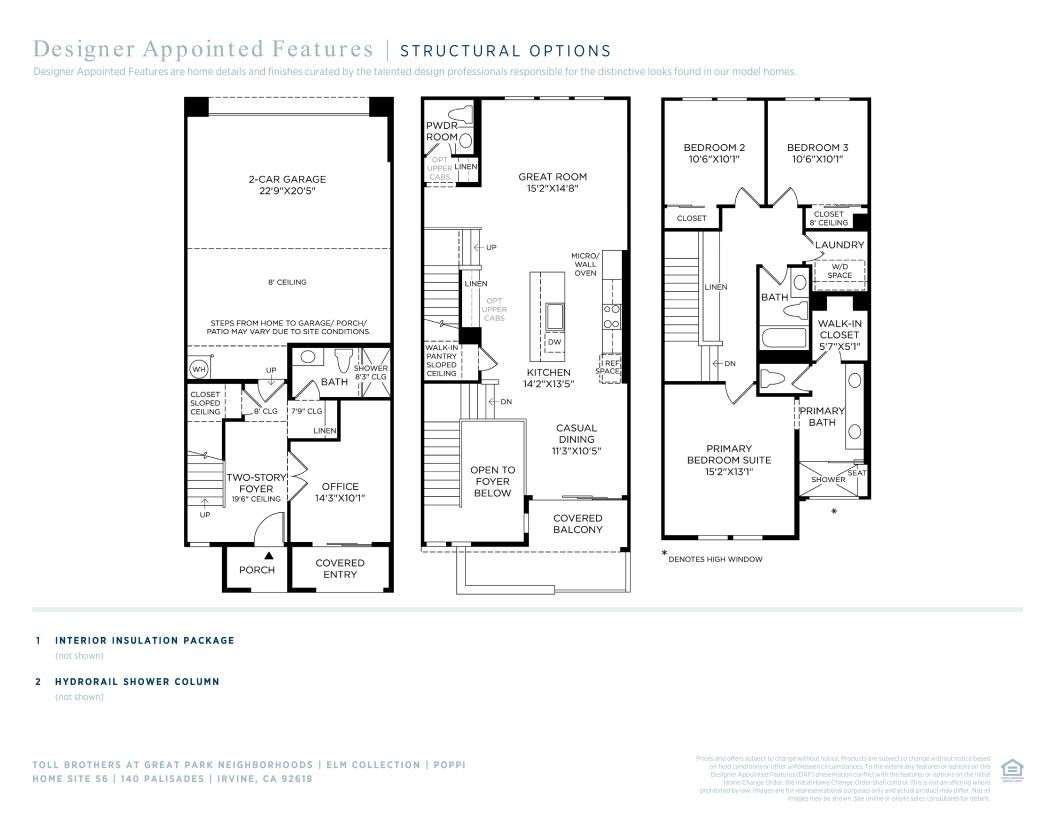 The Poppi home design features a versatile open floor plan ideal for both everyday living and stylish entertaining. A dramatic two-story foyer welcomes you into the home, leading past a beautifully appointed first-floor office and nearby hall bath. On the second level, a spacious great room flows into the kitchen and casual dining area, which opens to a covered balcony perfect for outdoor relaxation. The well-equipped kitchen includes a generous center island and a walk-in pantry. The third level is home to the luxurious primary suite, which offers a dual-sink vanity, shower with seat, private water closet, and walk-in closet. Two additional bedrooms share a full hall bath and are conveniently located near the central laundry room. Additional highlights include a powder room on the main living level, a covered front entry, and a two-car garage.