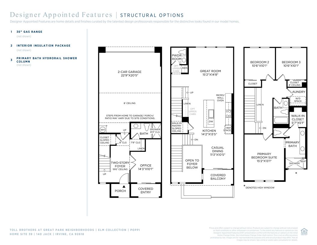 The Poppi home design features a versatile open floor plan ideal for both everyday living and stylish entertaining. A dramatic two-story foyer welcomes you into the home, leading past a beautifully appointed first-floor office and nearby hall bath. On the second level, a spacious great room flows into the kitchen and casual dining area, which opens to a covered balcony perfect for outdoor relaxation. The well-equipped kitchen includes a generous center island and a walk-in pantry. The third level is home to the luxurious primary suite, which offers a dual-sink vanity, shower with seat, private water closet, and walk-in closet. Two additional bedrooms share a full hall bath and are conveniently located near the central laundry room. Additional highlights include a powder room on the main living level, a covered front entry, and a two-car garage.