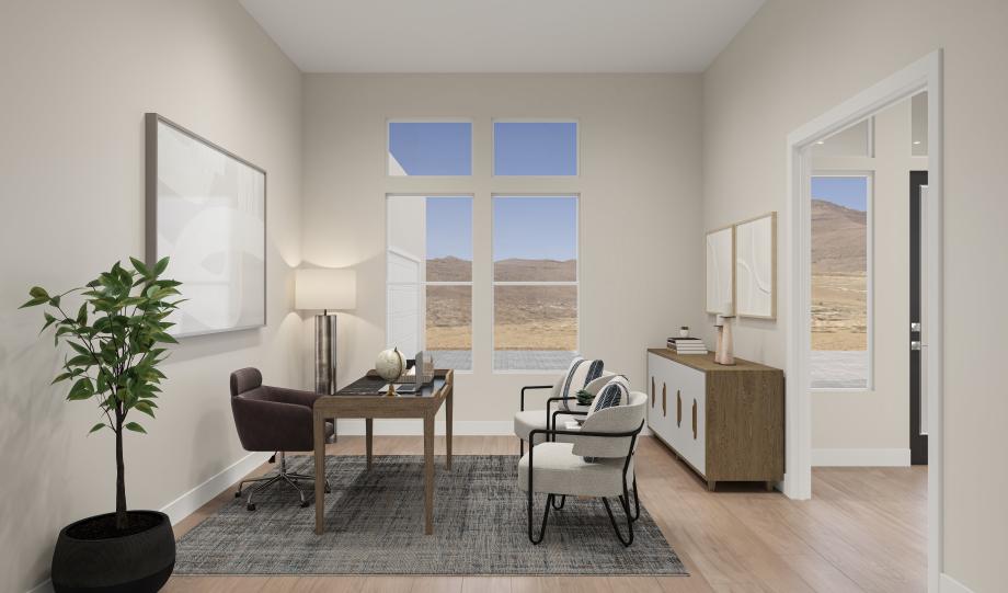 =The Canter home design seamlessly blends luxury and functionality, offering expansive living spaces designed for comfort and ease. The great room, anchored by a cozy fireplace, opens to an impressive outdoor living area, ideal for year-round entertaining and relaxation. The well-appointed kitchen features a spacious center island, walk-in pantry, and casual dining area that connects effortlessly to the main living space. A private office just off the foyer provides a quiet retreat for work or study. The primary suite serves as a peaceful sanctuary with dual walk-in closets and a spa-inspired bath complete with dual vanities, a soaking tub, a spacious shower with seat, and a private water closet. The three secondary bedrooms include a private bath and walk-in closet, offering comfort and privacy for family or guests. A versatile flex room at the front of the home adds additional everyday living space, and a powder room off the great room adds convenience. Additional highlights include a well-placed laundry room and dual two-car garages for ample storage and functionality.