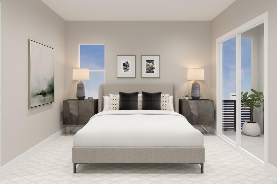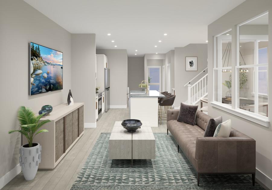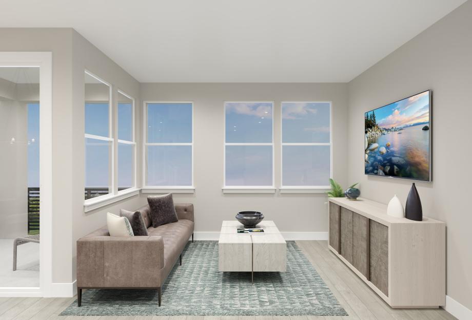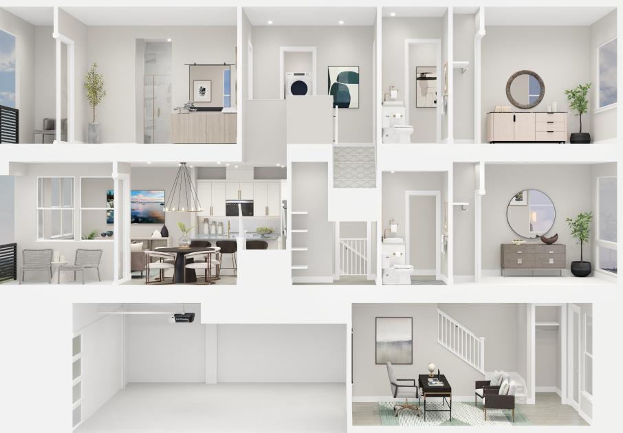 The Sana blends comfort and style across three thoughtfully designed levels. The foyer leads to a spacious first-floor flex room, perfect for work, wellness, or guests. On the second floor, the open-concept main living area connects the great room, kitchen, and casual dining space. The kitchen features a center island and walk-in pantry, while sliding doors open to a covered deck—ideal for outdoor dining or entertaining. A secondary bedroom with access to a full hall bath offers a welcoming space for guests or family. Upstairs, the private primary suite includes a generous walk-in closet and a spa-like bath with dual-sink vanity, a shower with seat, and a private water closet. A covered deck extends the suite outdoors. A secondary bedroom with a private bath, located near the laundry area, completes this well-appointed home.