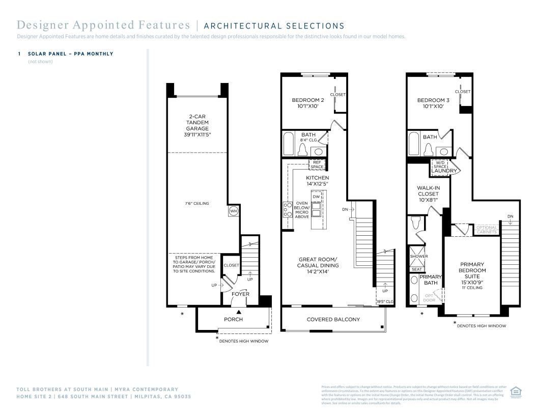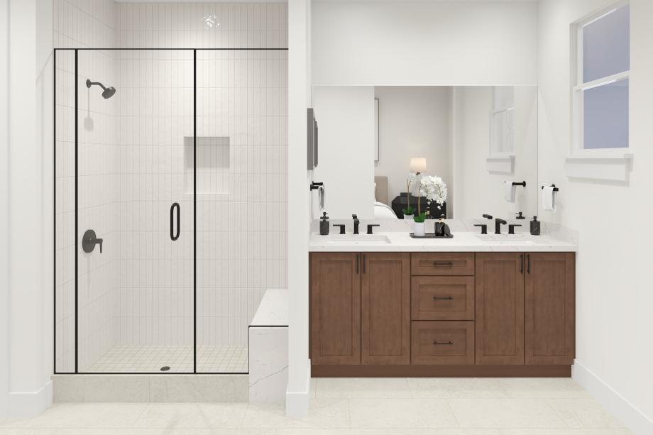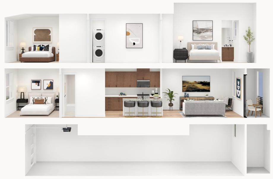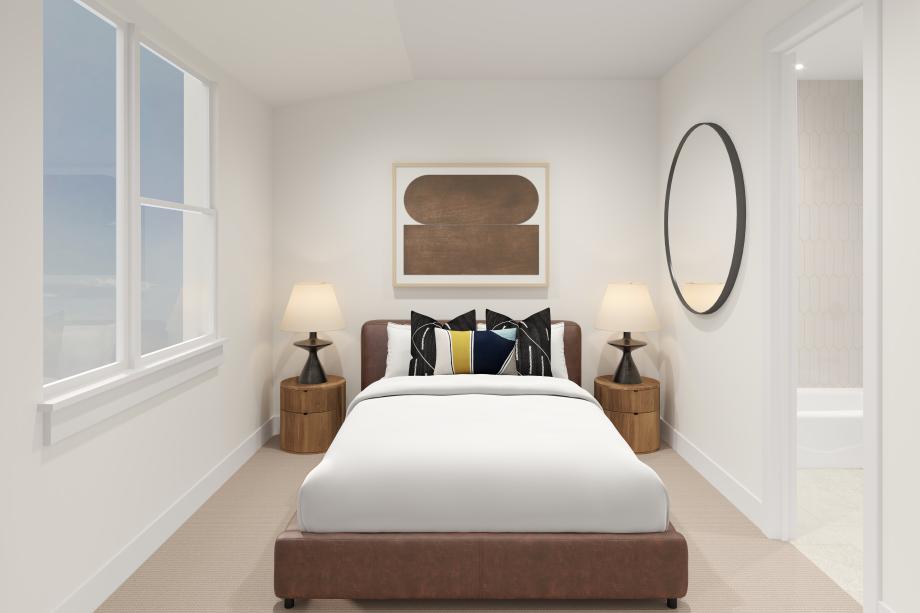 The Myra offers modern comfort across three thoughtfully designed levels. The first floor features a cozy foyer and access to the two-car garage. On the second level, an open-concept layout connects the spacious great room and casual dining area to the kitchen, which includes a center island with breakfast bar. A covered balcony just off the main living area creates space for outdoor dining or relaxing. A secondary bedroom with access to a full hall bath provides flexibility for guests or extended stays. The third floor is dedicated to private living, with a luxurious primary suite featuring a generous walk-in closet and a spa-inspired bath with dual vanities, a shower with seat, and a private water closet. A secondary bedroom with a private bath and a convenient third-floor laundry area complete the home.