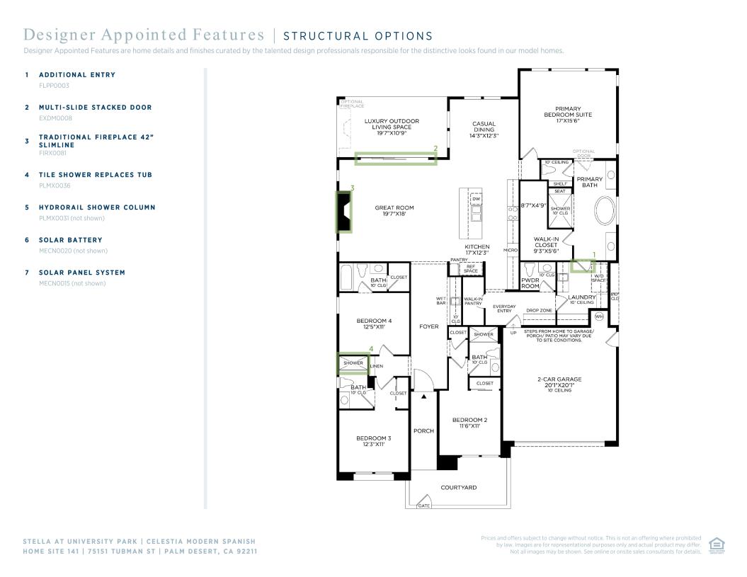 The Celestia presents an exquisite blend of luxury and functionality within its spacious, single-story floor plan. A beautiful private courtyard and porch lead into an extended foyer hallway opening onto the open-concept main living space. The spacious great room seamlessly connects to an expansive luxury outdoor living space that provides plenty of space for relaxing and entertaining. The well-appointed kitchen overlooks a cozy casual dining area and features a walk-in pantry, ample counter and cabinet space, as well as a large center island with breakfast bar. The stunning primary bedroom suite boasts a sizable walk-in closet and a lavish private bath complete with dual vanities, a freestanding tub, a luxe shower with seat, and a private water closet. Secondary bedrooms each come with their own private bath and are conveniently located off the foyer.