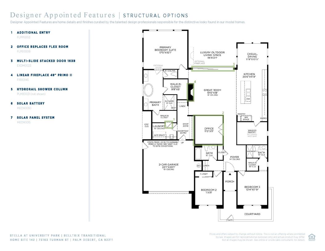 The Belltrix offers an elegant blend of style and functionality. A welcoming foyer flows past a versatile flex room into a stunning great room with access to an incredible luxury outdoor living space. A bright casual dining area overlooks the well-equipped kitchen, featuring a generous island with breakfast bar, ample counter and cabinet space, and a large walk-in pantry. The spacious primary bedroom is enhanced by two walk-in closets and a serene bath offering dual vanities, a luxe shower with seat, and a private water closet. At the front of the home are two lovely secondary bedrooms, one with a walk-in closet and a private bath, the other located just steps from a full hall bath.