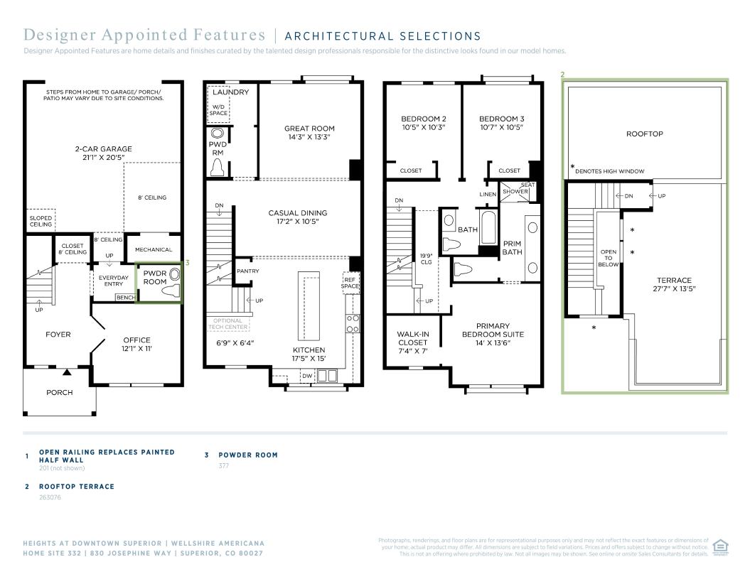 Deluxe urban family living. The Wellshire's welcoming covered entry and foyer reveal the inviting stairs to the second floor living level, opening to views of the bright great room and casual dining area. The well-designed kitchen overlooks a sunny breakfast nook with access to the desirable front covered balcony and is equipped with a large center island with breakfast bar, plenty of counter and cabinet space, and ample pantry. On the third floor, the marvelous primary bedroom suite is enhanced by a generous walk-in closet and spa-like primary bath with dual-sink vanity, luxe glass-enclosed shower with seat, and private water closet. Secondary bedrooms feature roomy closets and shared full hall bath. Additional highlights include a secluded office on the first floor, convenient powder room and centrally located laundry on the second floor, and additional storage throughout.