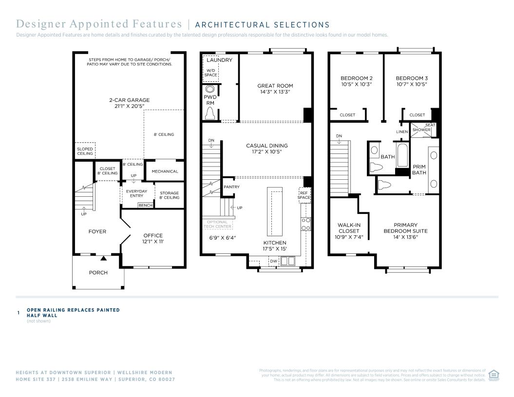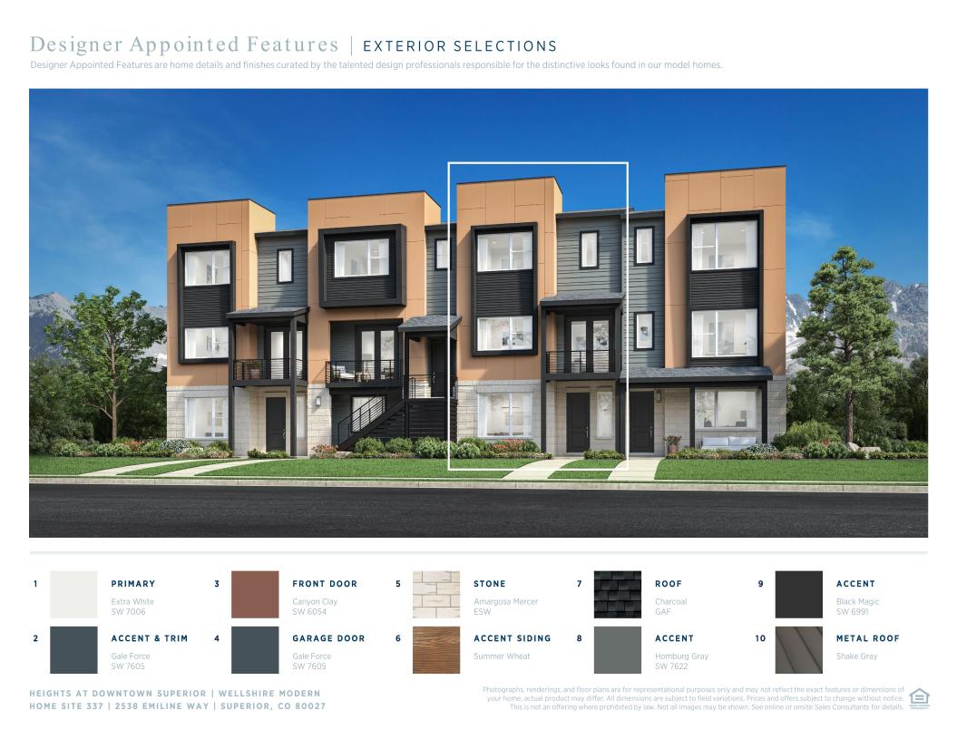 Deluxe urban family living. The Wellshire's welcoming covered entry and foyer reveal the inviting stairs to the second floor living level, opening to views of the bright great room and casual dining area. The well-designed kitchen overlooks a sunny breakfast nook with access to the desirable front covered balcony and is equipped with a large center island with breakfast bar, plenty of counter and cabinet space, and ample pantry. On the third floor, the marvelous primary bedroom suite is enhanced by a generous walk-in closet and spa-like primary bath with dual-sink vanity, luxe glass-enclosed shower with seat, and private water closet. Secondary bedrooms feature roomy closets and shared full hall bath. Additional highlights include a secluded office on the first floor, convenient powder room and centrally located laundry on the second floor, and additional storage throughout.