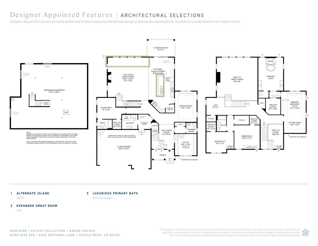 Luxurious family living. The Ogden's welcoming covered entry and impressive two-story foyer offer charming views of the formal dining room and expansive two-story great room. A bright casual dining area with access to a desirable covered patio overlooks the well-designed kitchen, equipped with a large center island with breakfast bar, plenty of counter and cabinet space, ample walk-in pantry, and pass through access to the formal dining room. The lovely primary bedroom suite is enhanced by a relaxing sitting area, spacious walk-in closet, and deluxe primary bath with dual vanities, large soaking tub, luxe glass-enclosed shower, and private water closet. Central to a versatile loft, the ample secondary bedrooms feature walk-in closets and shared full hall bath. Additional highlights include a generous office off the foyer, convenient powder room and everyday entry, centrally located laundry, and additional storage throughout.