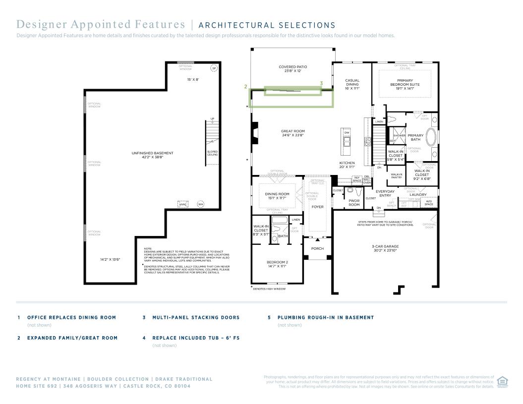 Modern deluxe style. The Drake's welcoming covered entry and foyer offer views of the spacious great room, dining room, and desirable covered patio beyond. Overlooking the main living areas, the well-designed kitchen is equipped with a large center island with breakfast bar, plenty of counter and cabinet space, and sizable walk-in pantry. The elegant primary bedroom suite boasts a spacious walk-in closet and deluxe primary bath with dual-sink vanity, large soaking tub, luxe shower with seat, drying area, and private water closet. The ample secondary bedroom features a roomy closet and access to a full hall bath. Additional highlights include a secluded office, centrally located laundry, and additional storage throughout.