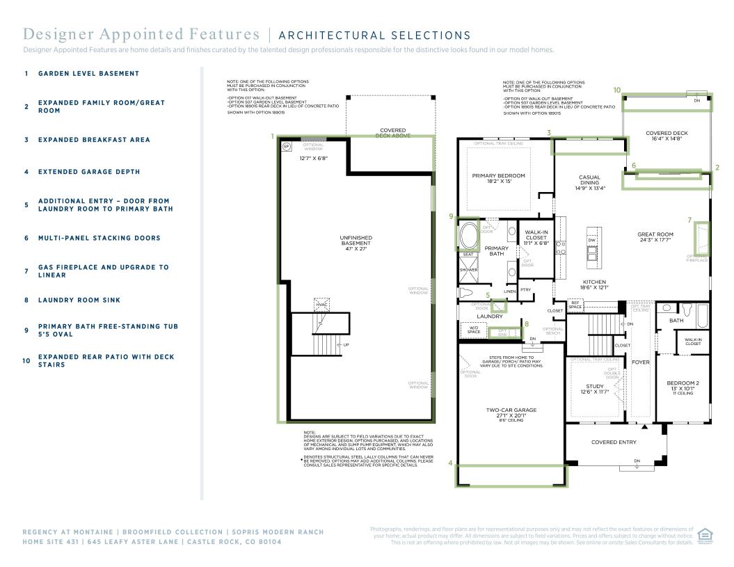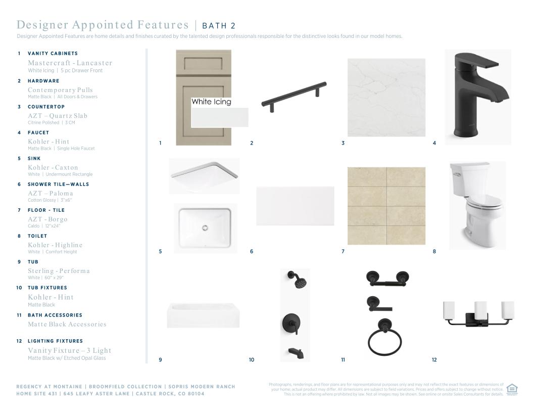 Contemporary family luxury. The Sopris' welcoming covered entry and extended foyer open immediately onto the bright flex space, revealing views to the expansive great room, casual dining area, and desirable covered porch beyond. The well-designed kitchen is equipped with a large center island with breakfast bar, plenty of counter and cabinet space, and sizable pantry. The marvelous primary bedroom suite is enhanced by a gigantic walk-in closet and spa-like primary bath with dual vanities, luxe glass-enclosed shower with seat, linen storage, and private water closet. The generous secondary bedroom features a walk-in closet and full hall bath access. Additional highlights include a thoughtful everyday entry, centrally located laundry, and additional storage.
