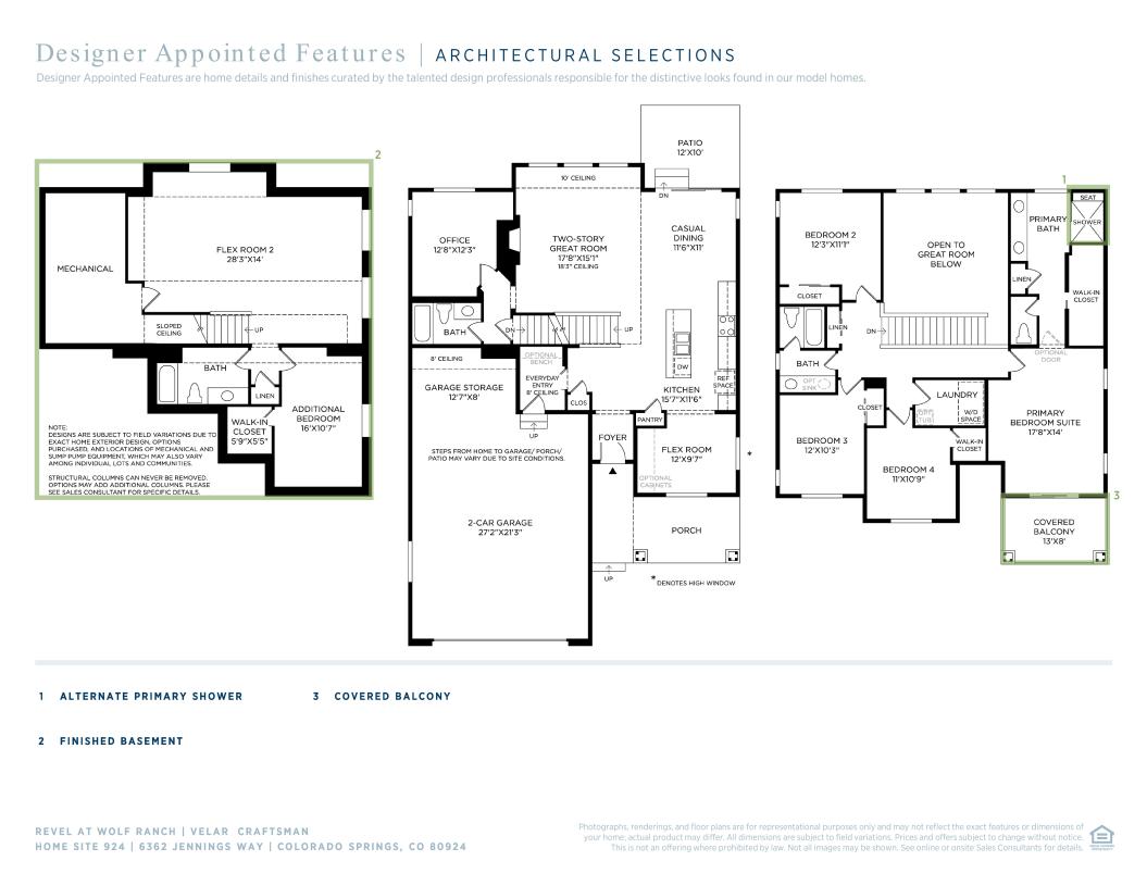 The Velar showcases an impressive two-story floor plan that combines style and functionality. The open-concept main living area connects a soaring two-story great room to the gourmet kitchen and casual dining area, creating a seamless layout for entertaining and relaxing. The kitchen is well-crafted, featuring a large center island with a breakfast bar and a sizable pantry. Off the kitchen, you'll find a versatile flex room that provides additional living space. Upstairs, the luxurious primary bedroom suite is highlighted by a sizable walk-in closet and a spa-like private bath with a dual-sink vanity, a luxe shower with seat, and a private water closet. Secondary bedrooms, one with a walk-in closet, are spacious and share a full hall bath. Rounding out the home is a private office off the great room, a cozy outdoor patio, a convenient everyday entry, a full bath on the first floor, bedroom-level laundry, and plenty of added storage.