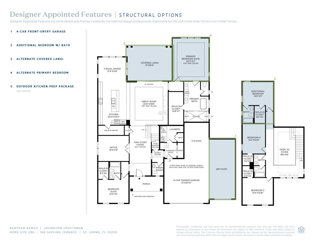 The two-story foyer of the impressive Julington showcases a grand staircase and opens to a private guest room and to the office with double-door entry. The expansive kitchen includes an abundance of counter space, a large walk-in pantry, a center island with seating, and an open view of the dining room, the great room, and the covered lanai. The first-floor primary bedroom suite boasts an enormous walk-in closet and a spectacular primary bathroom with an oversized shower with a seat, a dual-sink vanity with a dressing area, and a Roman tub. Other highlights include a covered entry, a convenient tucked-away laundry, spacious second-floor secondary bedrooms with walk-in closets, a second-floor gallery, and a foyer overlook.