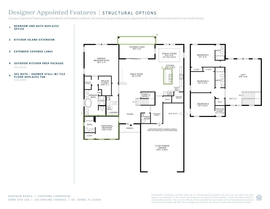 The Capstone home design is a beautiful two-story, single-family residence that offers luxury living at its finest. An open-concept floor plan merges the stunning great room with an impeccable kitchen featuring a large island and walk-in pantry. This level also includes a private primary suite with dual walk-in closets, an alluring primary bath with dual vanity sinks, freestanding tub and secluded water closet, as well as a flexible flex space, powder room, and laundry room. Upstairs contains three secondary bedrooms with sizable closets along with a versatile loft space.