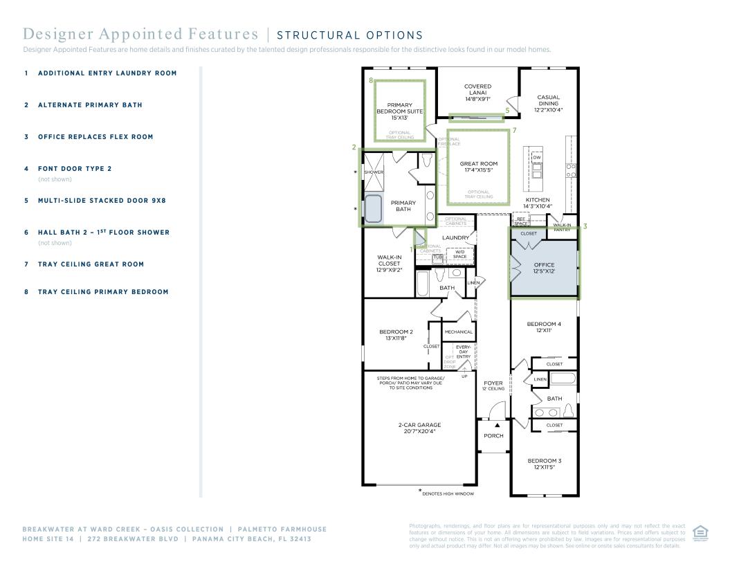 The Palmetto home design blends indoor and outdoor living with thoughtful spaces designed for comfort and style. From the welcoming foyer, you're led into an expansive great room that flows effortlessly into the casual dining area and gourmet kitchen, complete with a center island and walk-in pantry. Sliding doors from the dining space open to a spacious covered lanai, creating an ideal setting for year-round outdoor enjoyment. The private primary suite is a luxurious retreat featuring a generous walk-in closet and spa-inspired bath with a dual-sink vanity, spacious shower, and private water closet. Three secondary bedrooms are thoughtfully placed with access to nearby hall baths, offering ample space for family or guests. A versatile flex room provides additional everyday living space, perfect for a home office, playroom, or quiet retreat. Additional highlights include a central laundry room and an everyday entry from the two-car garage.