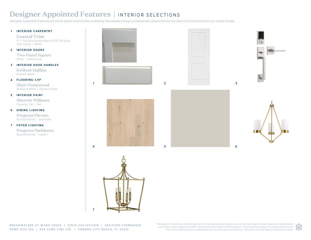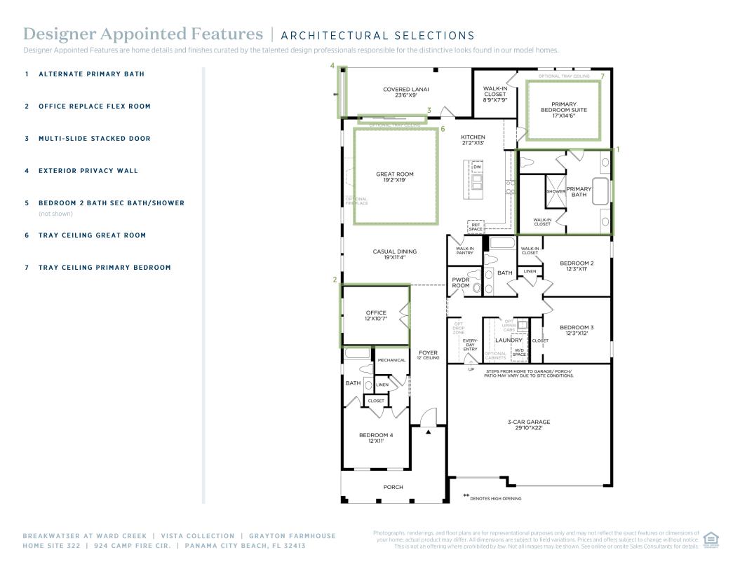 The Grayton is a beautiful single-story home that combines elegance and functionality. Guests are greeted by an inviting foyer that flanks the flex room, perfect for your office or hobby space. At the heart of this house lies an open floor plan where the great room seamlessly connects with the casual dining area and well-appointed kitchen, featuring a desirable island and walk-in pantry. A serene primary suite boasts dual walk-in closets and a luxurious private bath complete with dual vanities, private water closet, and lavish shower. Three secondary bedrooms offer plenty of space for family members or guests while a dedicated laundry room adds practicality to luxury living. An expansive covered lanai provides an ideal outdoor living space, perfect for relaxation or entertaining.