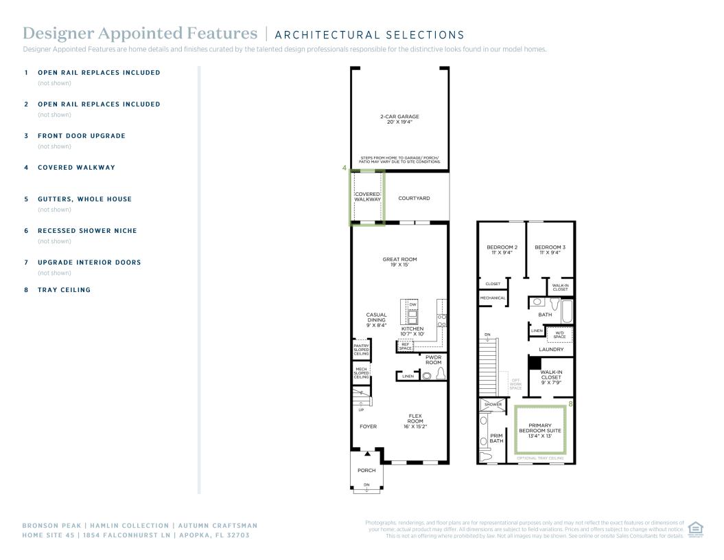 The Autumn's inviting stepped covered porch and welcoming foyer open immediately onto the bright flex room, offering views to the lovely casual dining area, spacious great room, and desirable rear courtyard beyond. The well-appointed kitchen is enhanced by a large center island with breakfast bar, plenty of counter and cabinet space, and roomy pantry. The beautiful primary bedroom suite is highlighted by a sizable walk-in closet and spa-like primary bath with dual-sink vanity and large luxe shower. Secondary bedrooms feature ample closets and shared hall bath. Additional highlights include a convenient powder room, centrally located laundry, and additional storage.