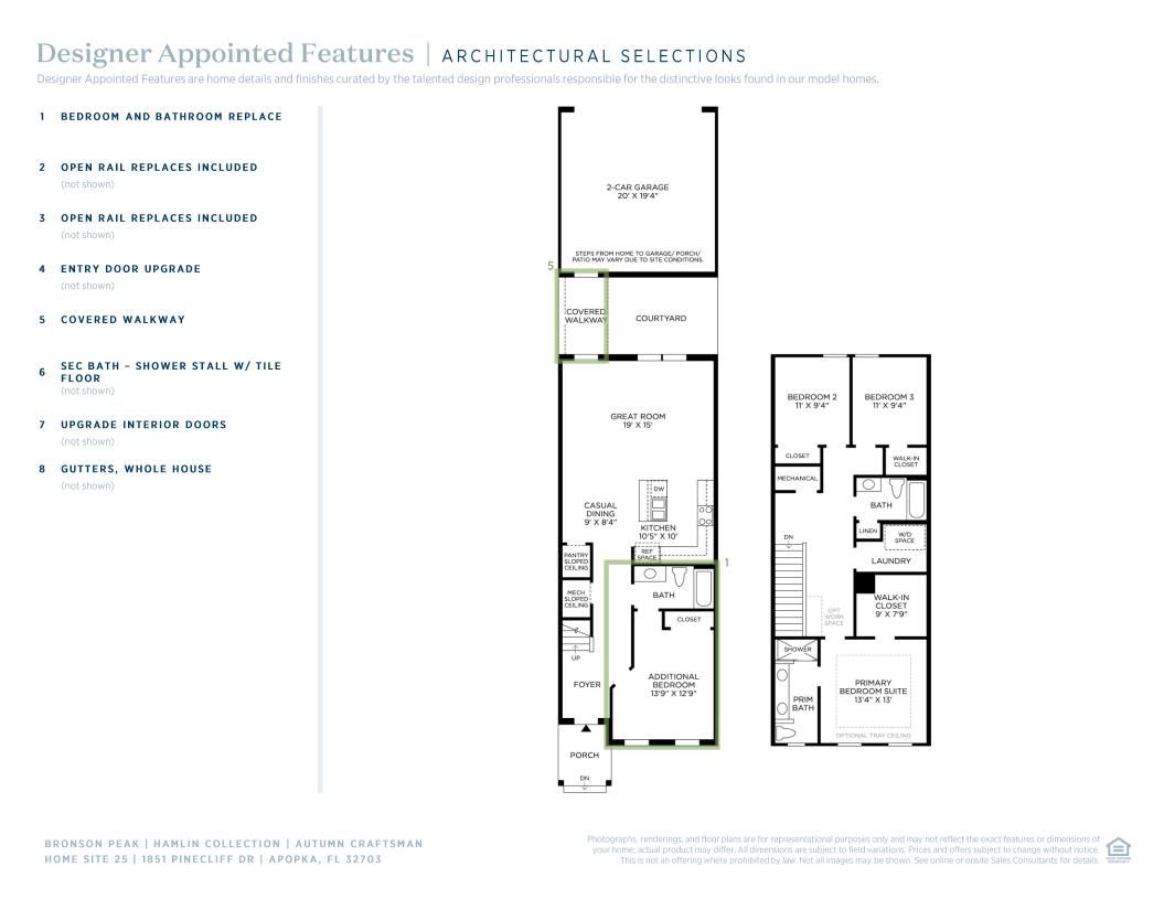 The Autumn's inviting stepped covered porch and welcoming foyer open immediately onto the bright flex room, offering views to the lovely casual dining area, spacious great room, and desirable rear courtyard beyond. The well-appointed kitchen is enhanced by a large center island with breakfast bar, plenty of counter and cabinet space, and roomy pantry. The beautiful primary bedroom suite is highlighted by a sizable walk-in closet and spa-like primary bath with dual-sink vanity and large luxe shower. Secondary bedrooms feature ample closets and shared hall bath. Additional highlights include a convenient powder room, centrally located laundry, and additional storage.