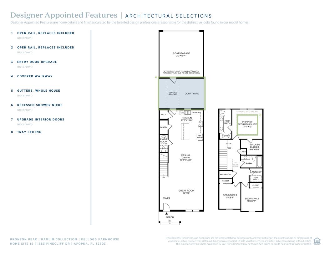 The Kellogg's inviting stepped porch and foyer open onto the spacious great room, casual dining area, and desirable rear courtyard beyond. The well-appointed kitchen is complete with a large center island with breakfast bar, plenty of counter and cabinet space, and sizable pantry. The gorgeous primary bedroom suite is highlighted by a gigantic walk-in closet and spa-like primary bath with dual-sink vanity and large luxe shower. Secluded secondary bedrooms feature ample closets and shared hall bath. Additional highlights include a convenient powder room, centrally located laundry, and additional storage.