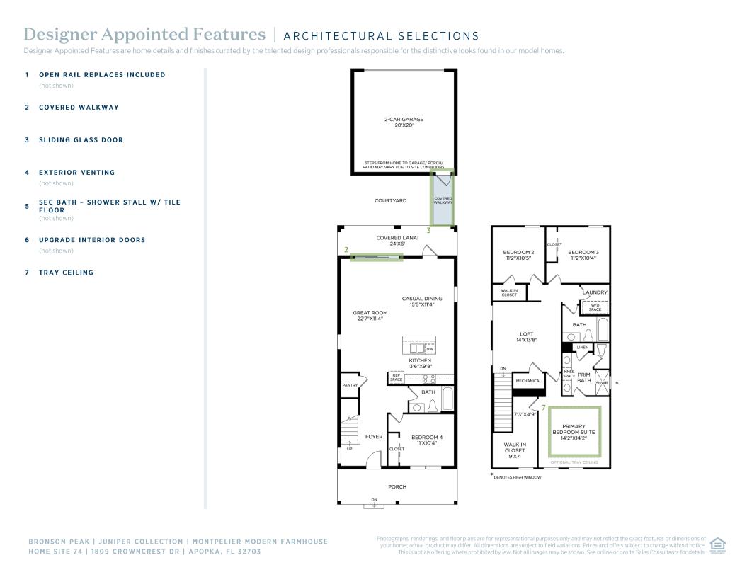 Charming contemporary living. The Montpelier's welcoming porch and entry reveal the inviting foyer and views to the spacious great room, dining room, and desirable covered lanai beyond. The well-designed gourmet kitchen is equipped with a large center island with breakfast bar, plenty of counter and cabinet space, and sizable walk-in pantry. The private primary bedroom suite is highlighted by a palatial walk-in closet and spa-like primary bath with dual-sink vanity, large luxe shower, linen storage, and private water closet. Central to a generous loft, the ample secondary bedrooms feature roomy closets and shared hall bath. Additional highlights include a desirable bedroom suite with closet and shared hall bath off the foyer, centrally located laundry, and additional storage.