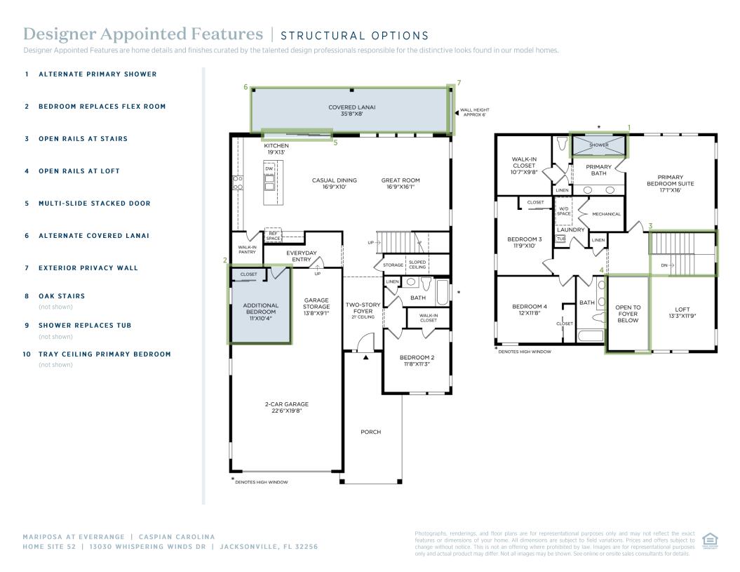 As soon as you step into the Caspian, you’re greeted with a soaring foyer. Upon passing through, you’re met with an impressive great room that connects with the casual dining area and kitchen area. The well-equipped kitchen, which includes a large center island and walk-in pantry, provides an ideal space for hosting and meals. A covered lanai provides additional space for outdoor entertaining. Upstairs, the primary bedroom features a generous walk-in closet and a luxurious primary bath with a dual-sink vanity, a private water closet, and a relaxing shower to complete the spa-like atmosphere. Two well-appointed secondary bedrooms are located near a full hall bathroom, and a convenient loft adds additional living space. The Caspian also includes a first-floor bedroom for guests or family, a flex room, a bedroom-level laundry room, an everyday entry, and a spacious two-car garage with additional storage.