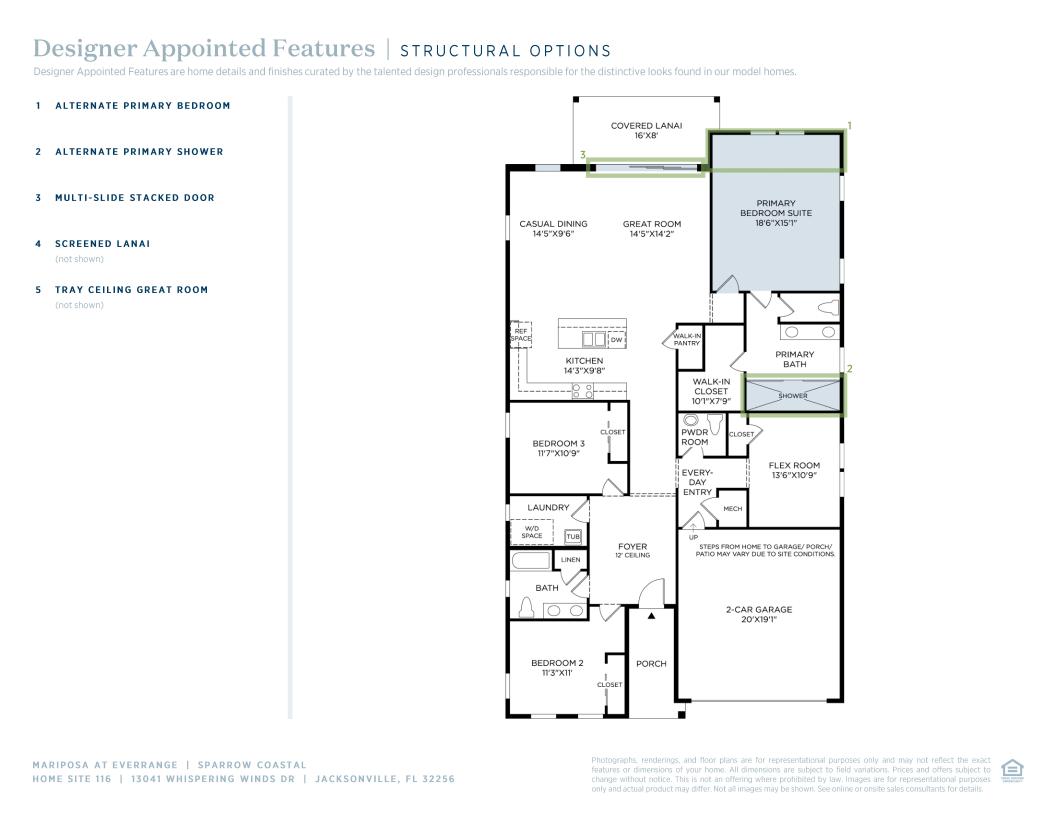 The Sparrow showcases an elegant single level floor plan, providing both luxury and comfort. As you walk through a welcoming foyer, you're greeted by an open-concept main living area that seamlessly connects the kitchen, great room, and a casual dining area. The heart of the home is the well-appointed kitchen, featuring a large center island with a breakfast bar and a generous walk-in pantry. Outdoor living is offered with a covered lanai, perfect for relaxation or entertaining guests. The dazzling primary bedroom suite is a true retreat, featuring an ample walk-in closet, and a luxurious primary bath with dual vanities, a relaxing shower, and a private water closet. Two secondary bedrooms share a full hall bath, while a powder room adds convenience.. The home's versatility is enhanced by a flex room that can be customized to suit various needs. The Sparrow is rounded out with an expansive two-car garage and an everyday entry.