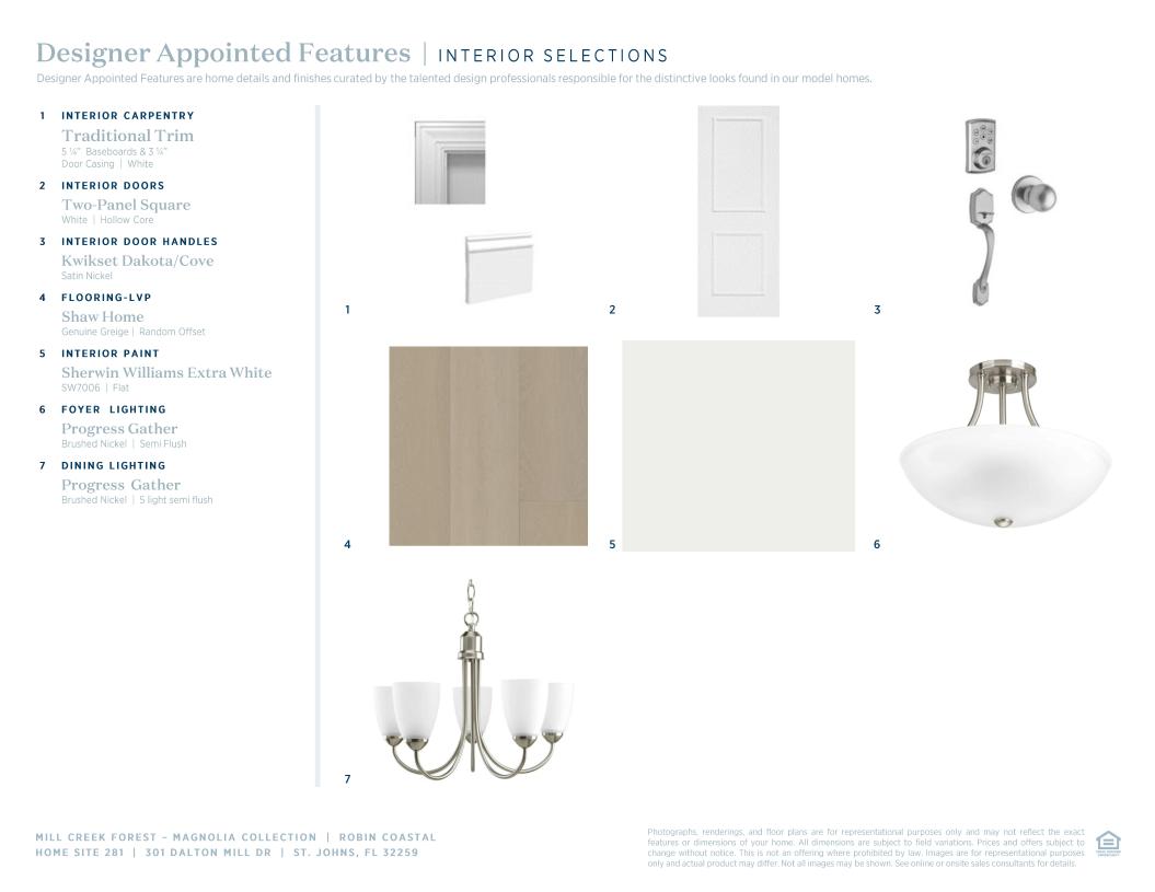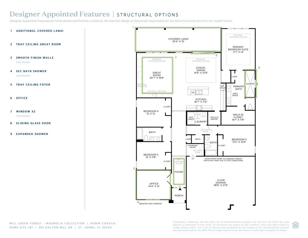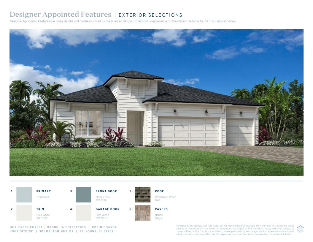 Deluxe family living. The Robin's welcoming covered porch and inviting foyer hallway flow into the expansive great room and casual dining area, with views to the desirable covered lanai beyond. The well-equipped gourmet kitchen is enhanced by a large center island with breakfast bar, plenty of counter and cabinet space, and generous walk-in pantry. The private primary bedroom suite is highlighted by a king-size walk-in closet and spa-like primary bath with dual-sink vanity, large luxe shower, linen storage, and private water closet. Secondary bedrooms feature roomy closets and two shared hall baths, one with dual-sink vanity. Additional highlights include a versatile flex room at front of home, centrally located laundry, and additional storage.