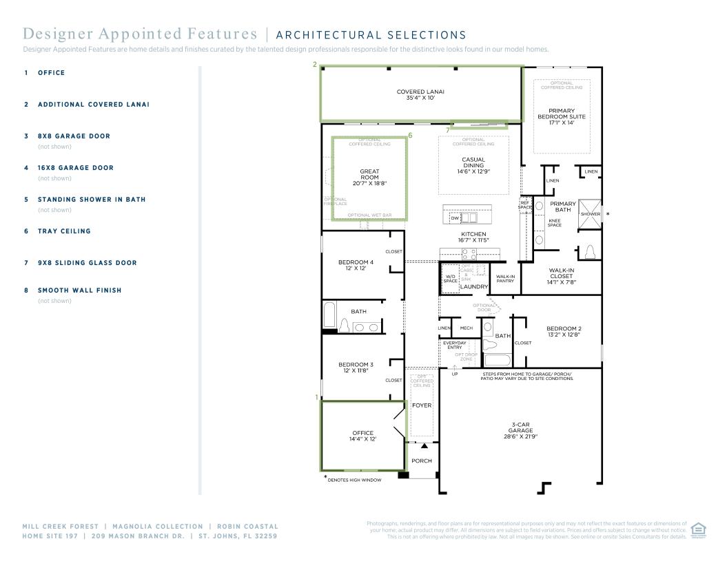 Deluxe family living. The Robin's welcoming covered porch and inviting foyer hallway flow into the expansive great room and casual dining area, with views to the desirable covered lanai beyond. The well-equipped gourmet kitchen is enhanced by a large center island with breakfast bar, plenty of counter and cabinet space, and generous walk-in pantry. The private primary bedroom suite is highlighted by a king-size walk-in closet and spa-like primary bath with dual-sink vanity, large luxe shower, linen storage, and private water closet. Secondary bedrooms feature roomy closets and two shared hall baths, one with dual-sink vanity. Additional highlights include a versatile flex room at front of home, centrally located laundry, and additional storage.