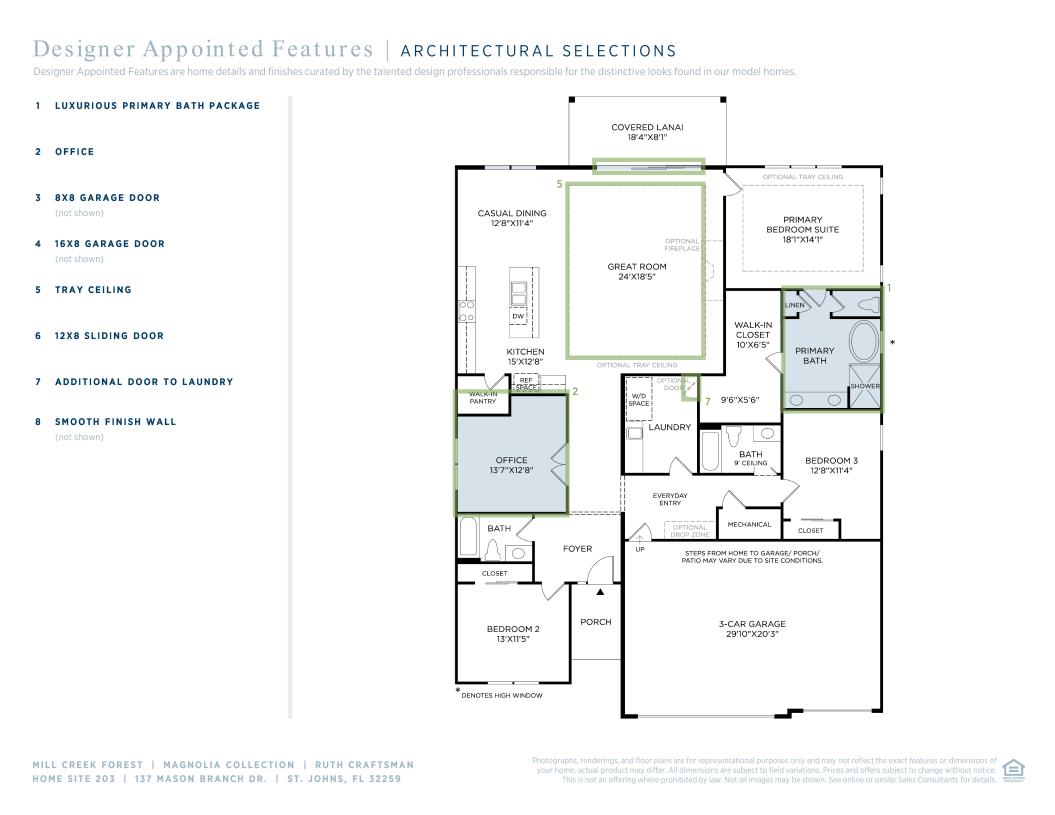 The Ruth home design embraces elegance and simplicity. An inviting foyer leads past a versatile flex room into the gorgeous main living area, complete with a spacious great room, a bright casual dining area, and a lovely covered lanai. Adjacent, the thoughtfully designed kitchen features a generous island with breakfast bar, a walk-in pantry, and plentiful cabinet and counter space. Retreat to the elegant primary bedroom, complete with a large walk-in closet and a serene bath featuring a dual-sink vanity, a luxe shower, linen storage, and a private water closet. Charming secondary bedrooms each have access to full hall baths. Other desirable features include an everyday entry, centrally located laundry, and extra storage throughout.
